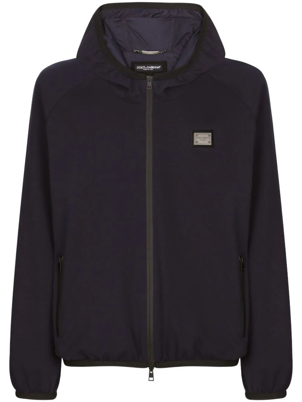 midnight blue cotton blend jersey texture contrasting trim classic hood two-way zip fastening two zip-fastening pockets long raglan sleeves straight hem