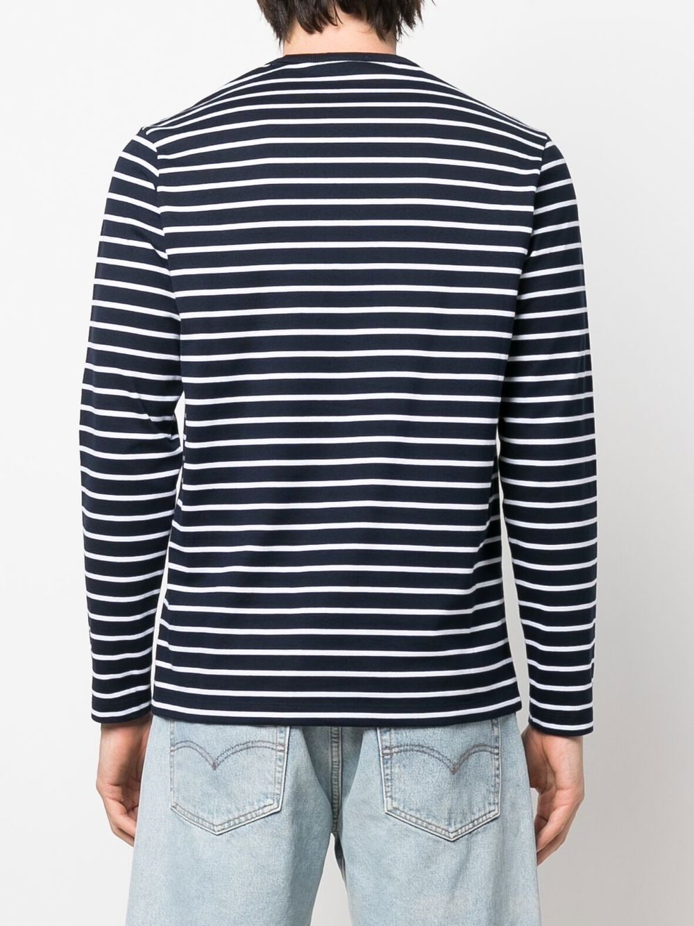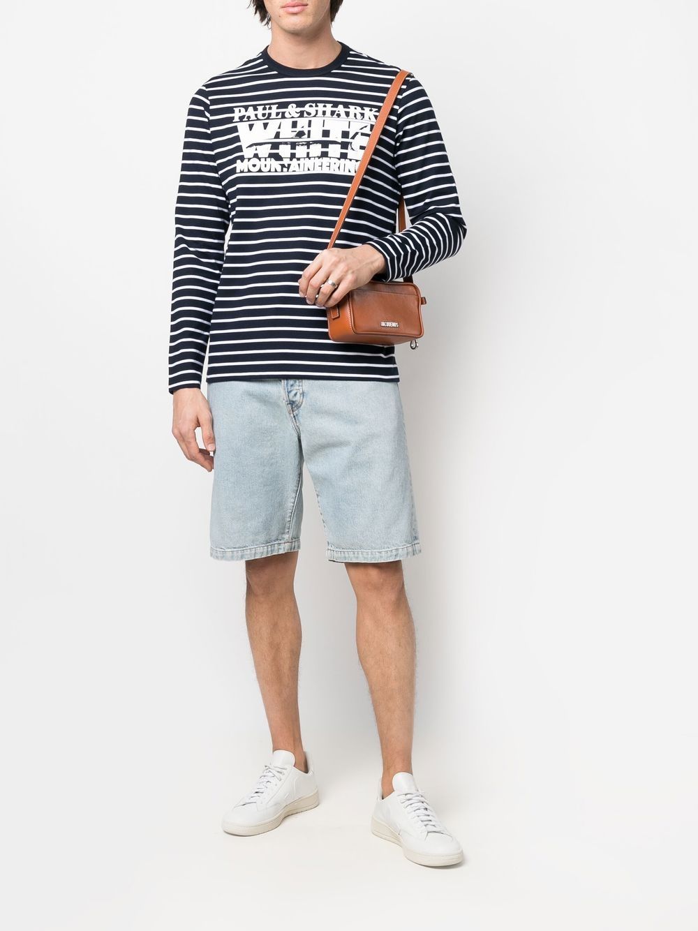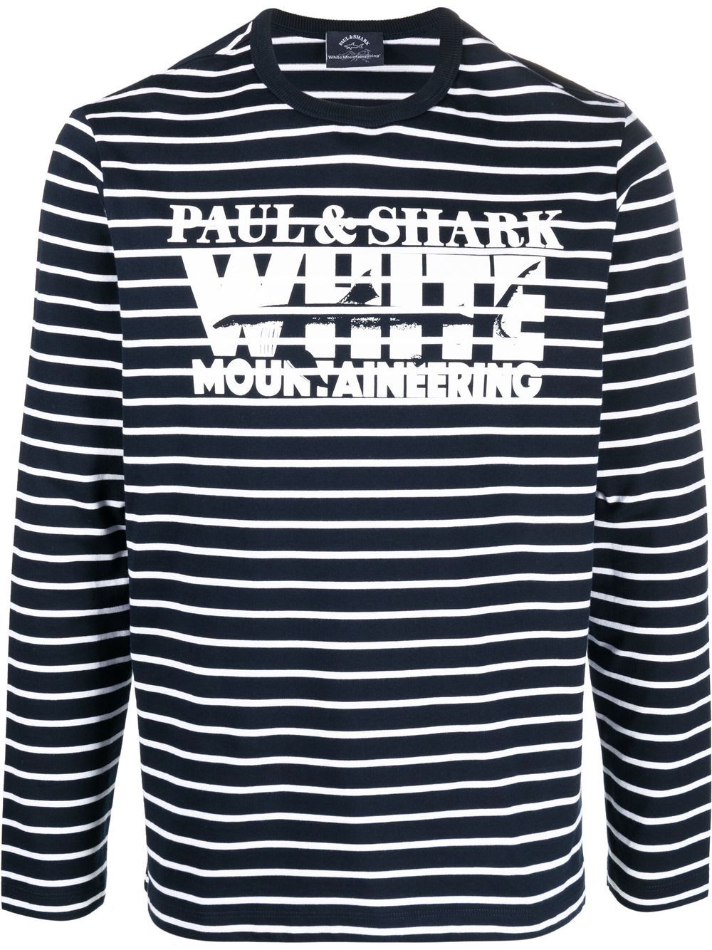Navy blue/white cotton logo-print striped T-shirt from PAUL & SHARK featuring jersey knit, logo print to the front, horizontal stripe print, round neck, long sleeves and straight hem.