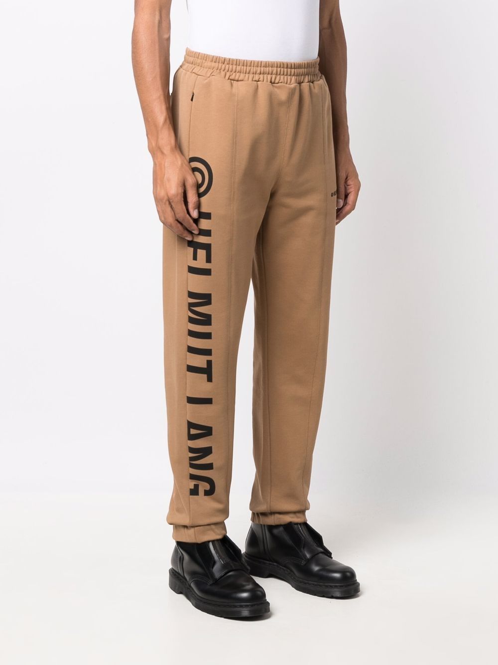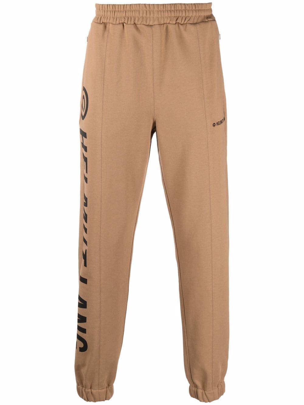 Walnut brown cotton logo-print track pants from HELMUT LANG featuring logo print to the side, two side slit pockets, rear patch pocket, elasticated waistband and elasticated ankles.