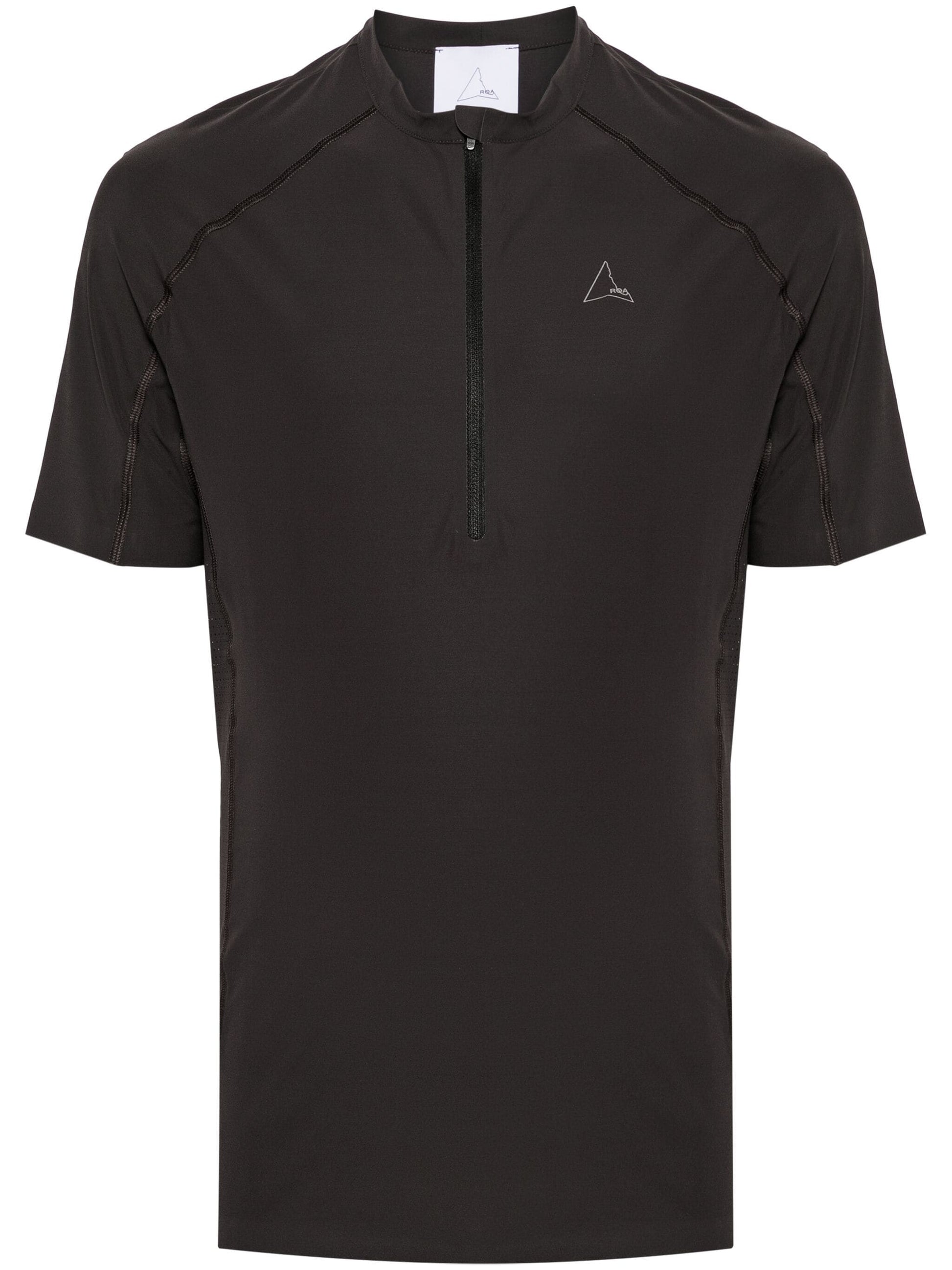 black stretch-design technical jersey logo print at the chest crew neck short raglan sleeves perforated detailing to the sides straight hem half front zip fastening