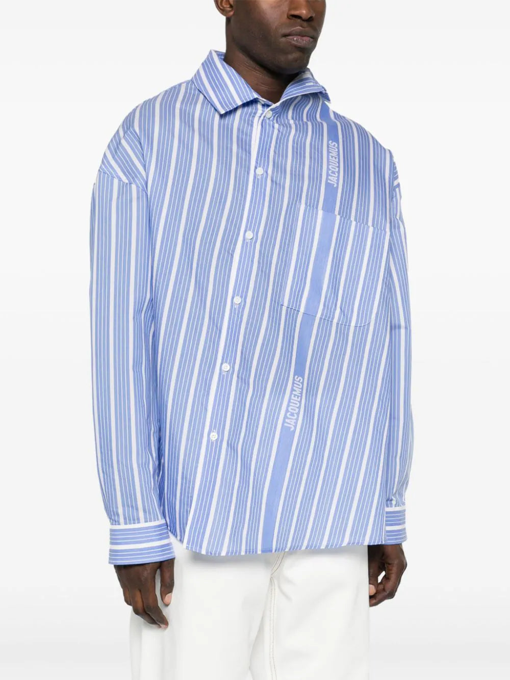 blue/white silk virgin-wool blend vertical stripe print spread collar drop shoulder long sleeves buttoned cuffs chest patch pocket internal logo tag curved hem diagonal front button fastening