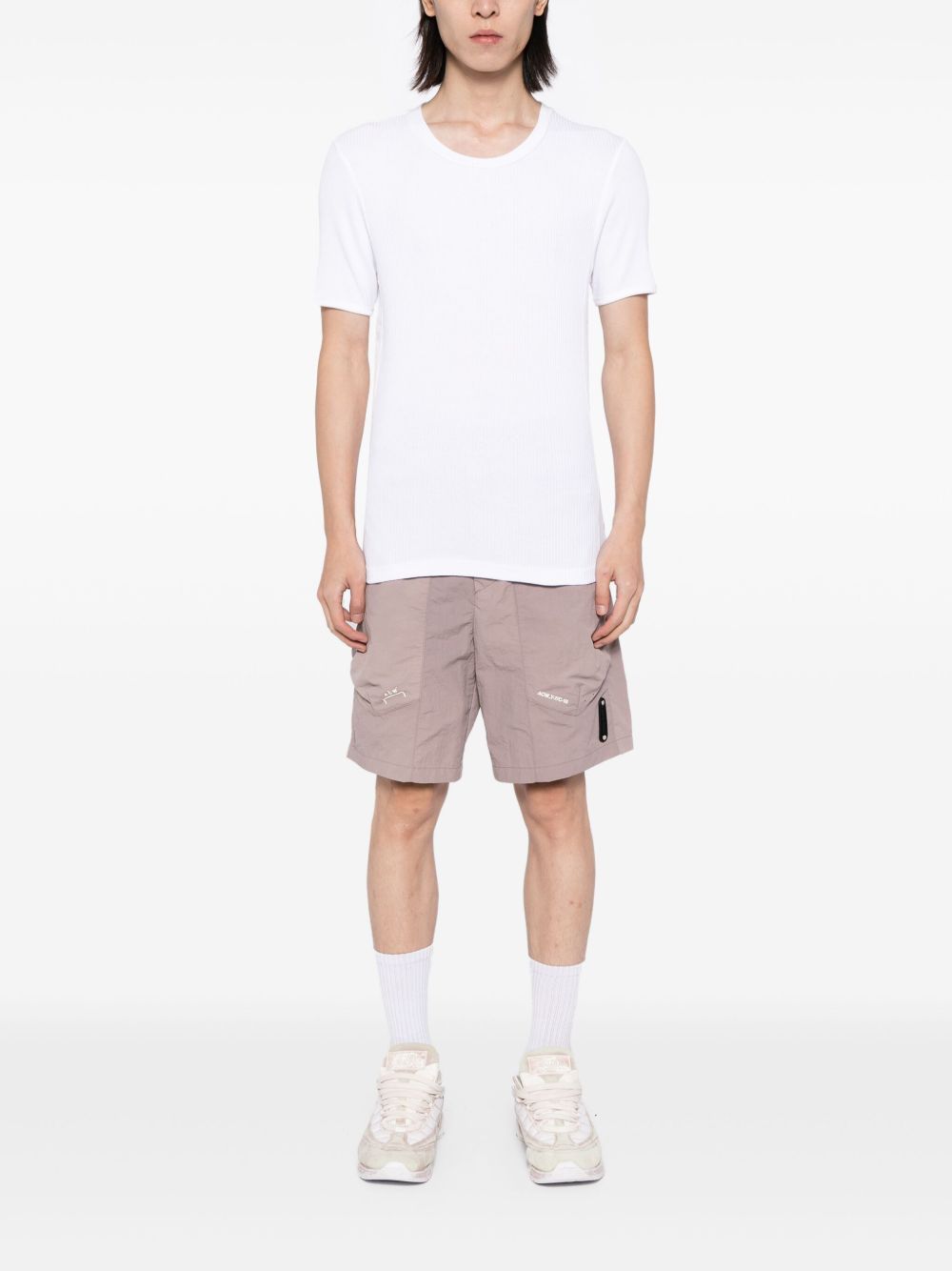 Expertly crafted from a white cotton blend, this Logo-Tape Ribbed T-Shirt features stretch-design for maximum comfort. The ribbed knit crew neck and short sleeves provide a flattering fit, while the logo-tape detailing adds a touch of sophistication. Perfect for any casual occasion.