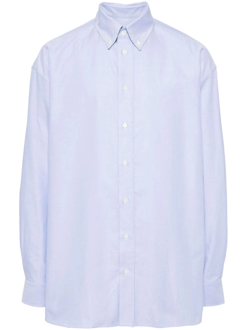 light blue cotton button-down collar front button placket drop shoulder long sleeves buttoned cuffs curved hem