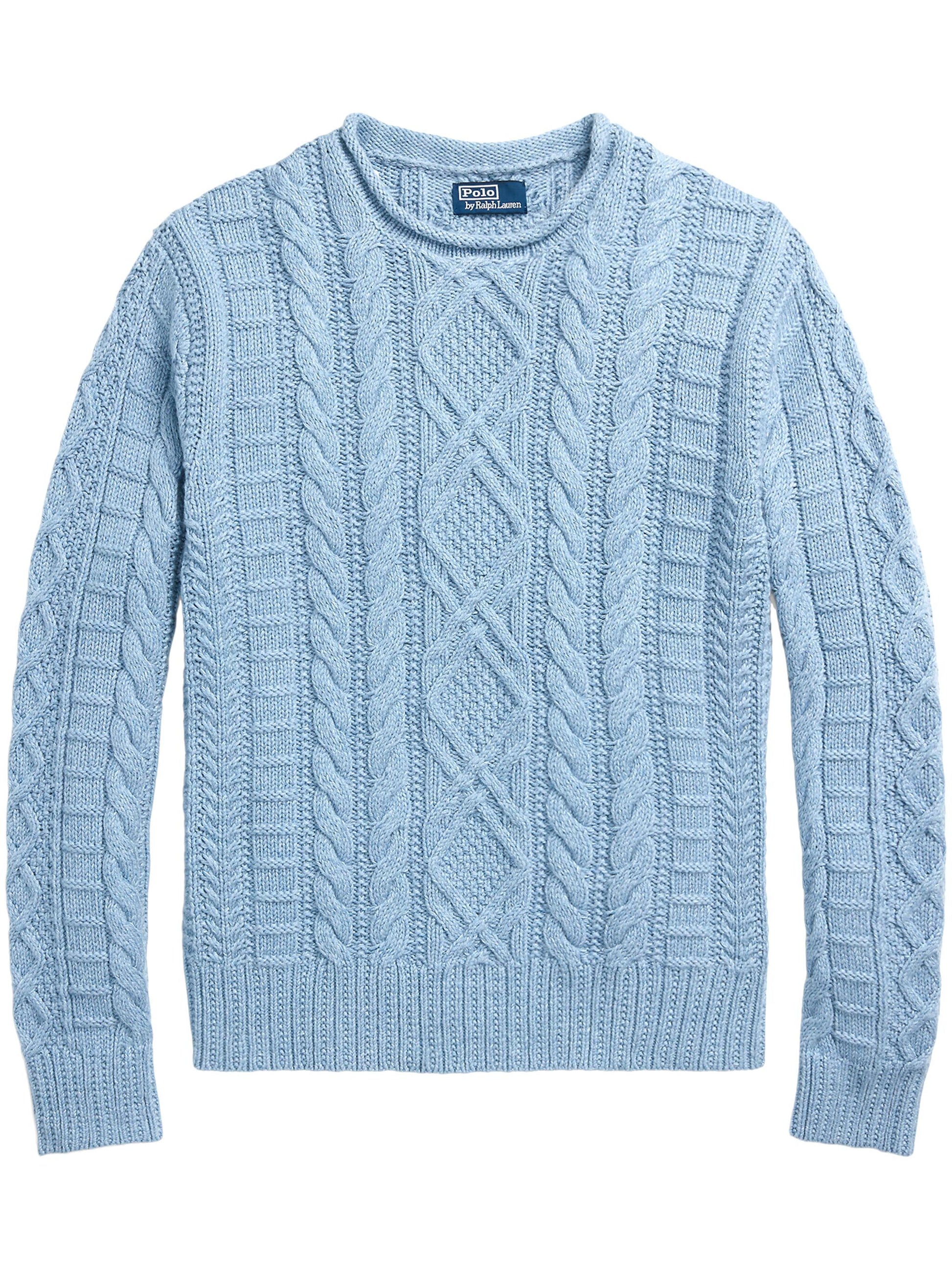 This blue cotton blend pullover features a knitted construction for a cozy, warm feel. The roll neck and long sleeves keep you stylish and comfortable, while the ribbed cuffs and hem add a touch of texture. Perfect for cooler weather, this pullover is a wardrobe essential.