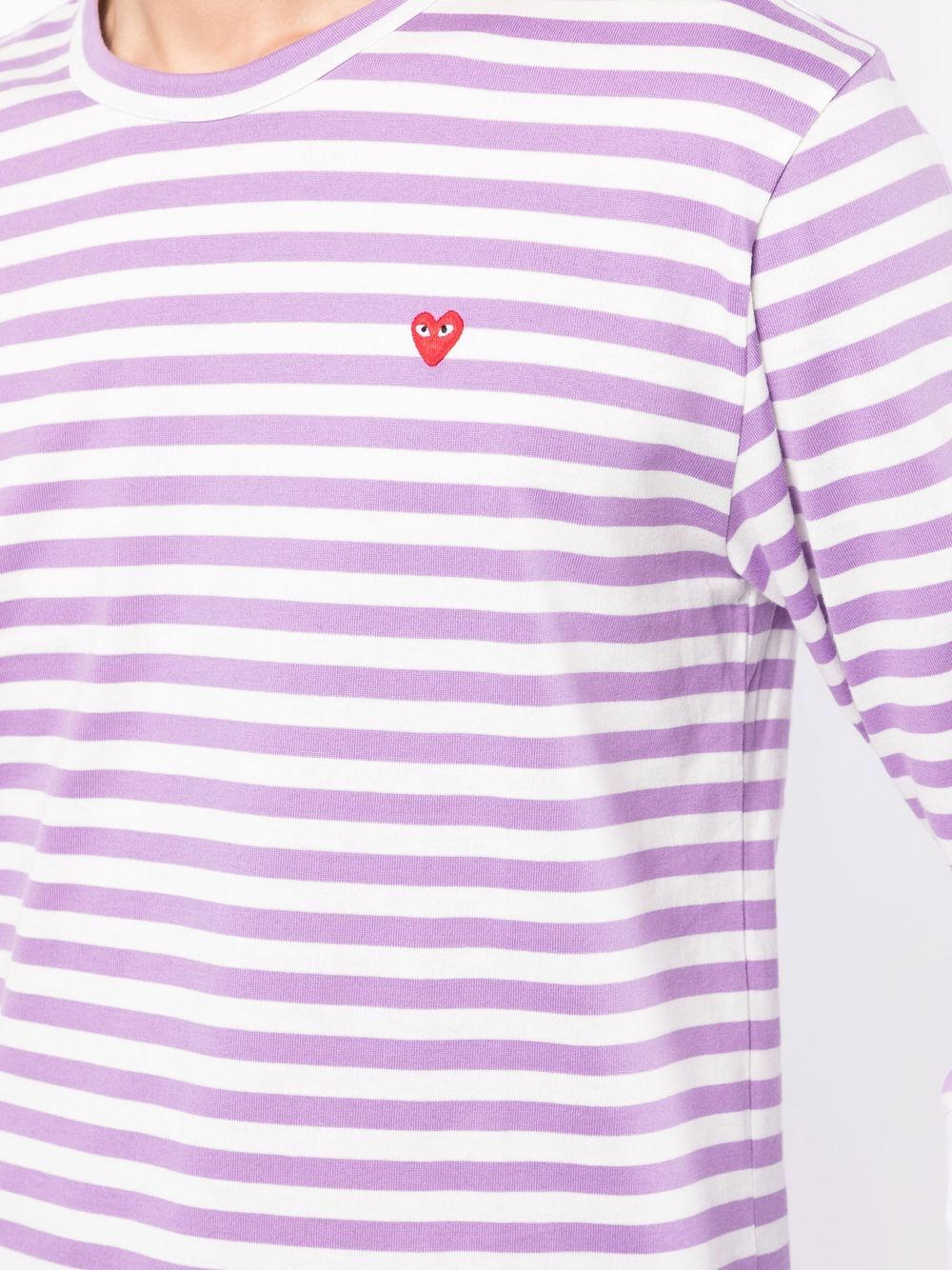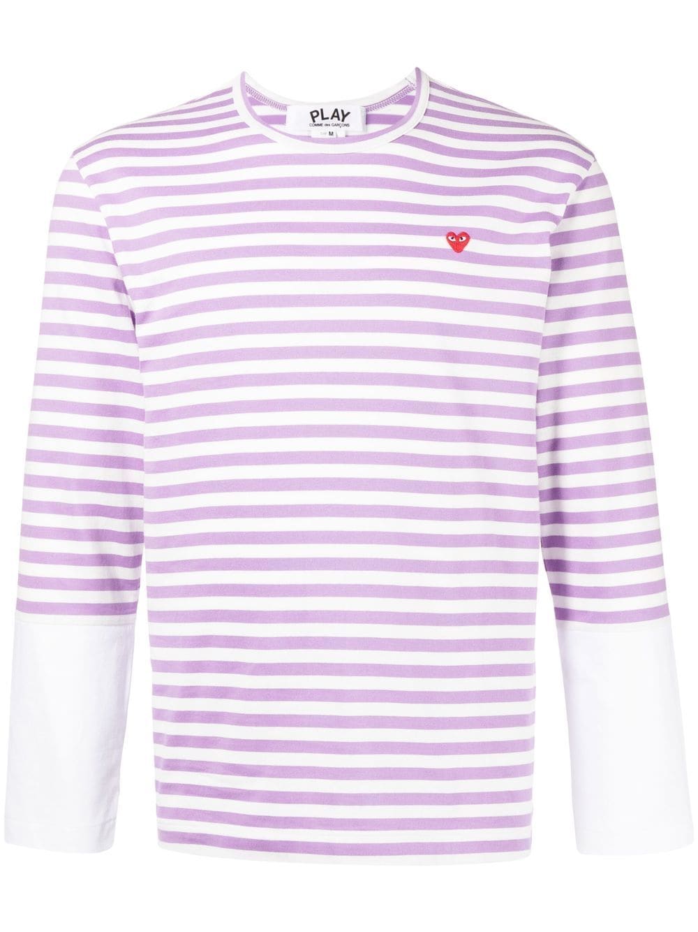 long-sleeve striped T-shirt from COMME DES GARÇONS PLAY featuring purple, white, cotton, horizontal stripe pattern, signature heart patch, long sleeves, round neck and straight hem.