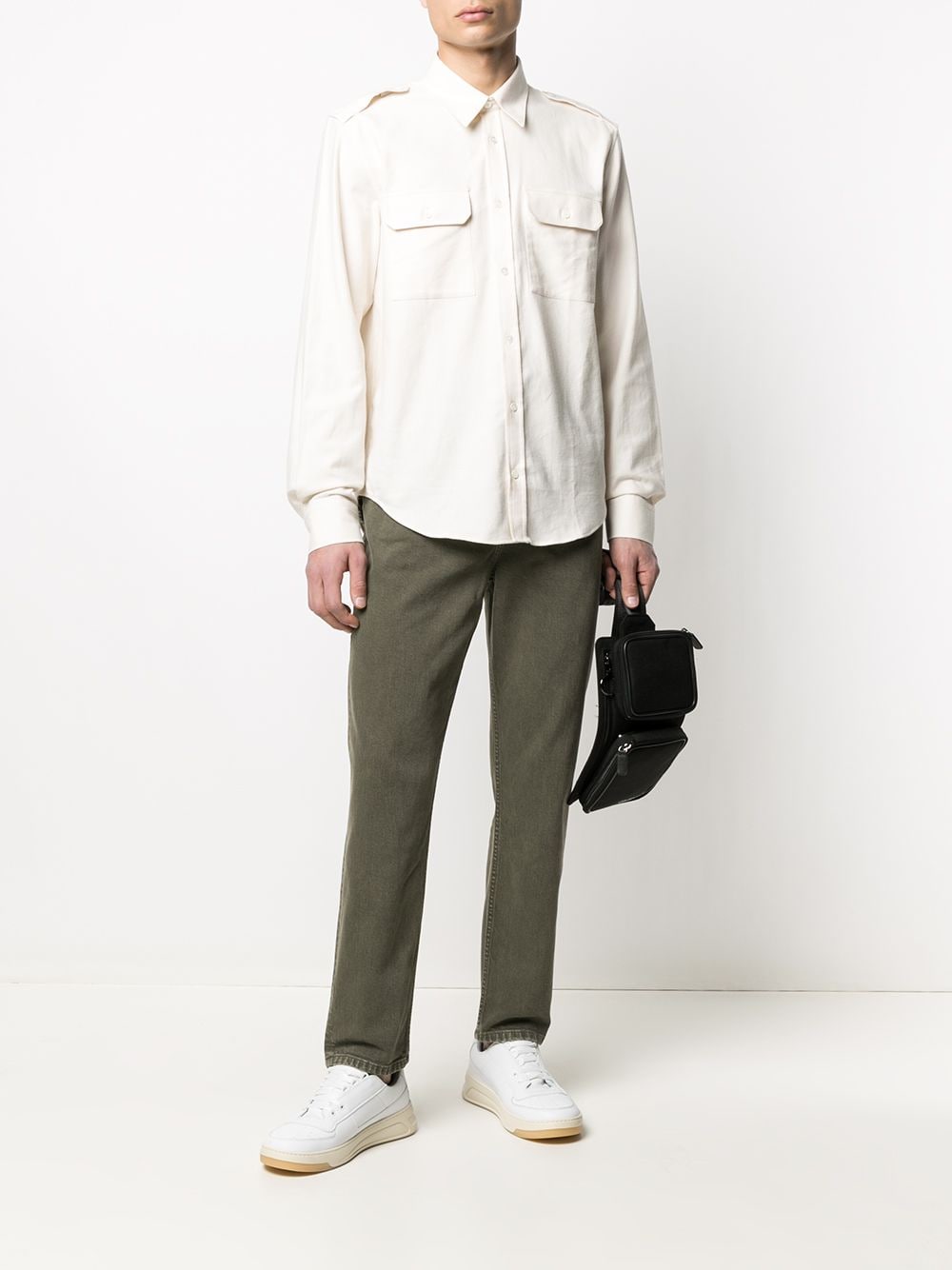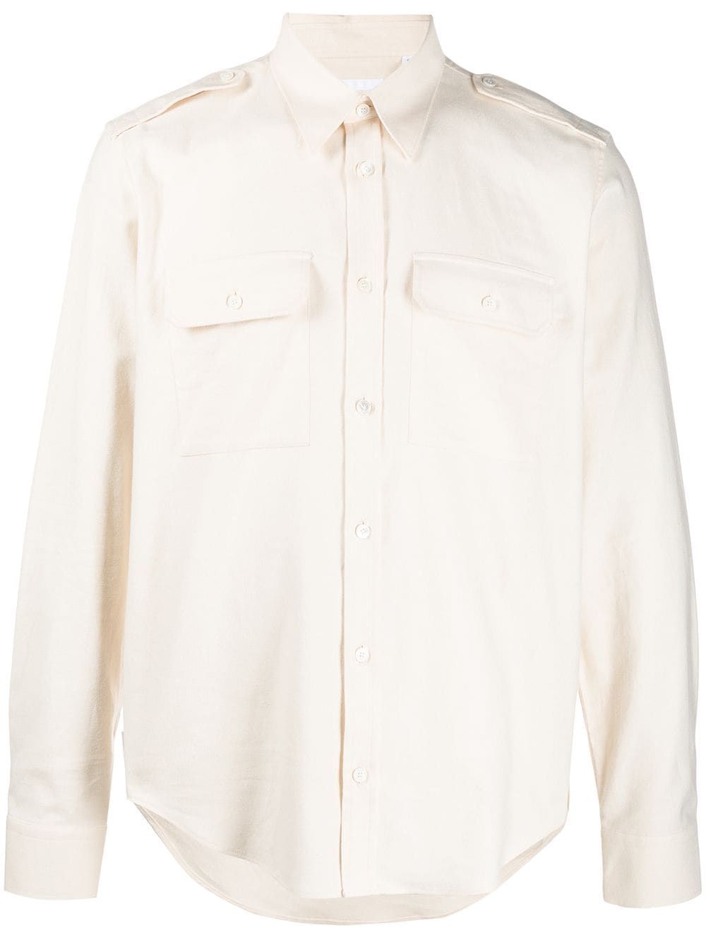 Ivory-white cotton long-sleeved strappy shirt from HELMUT LANG featuring classic collar, front button fastening, long sleeves, buttoned cuffs, front flap pockets, asymmetric hem and adjustable crossover rear straps.