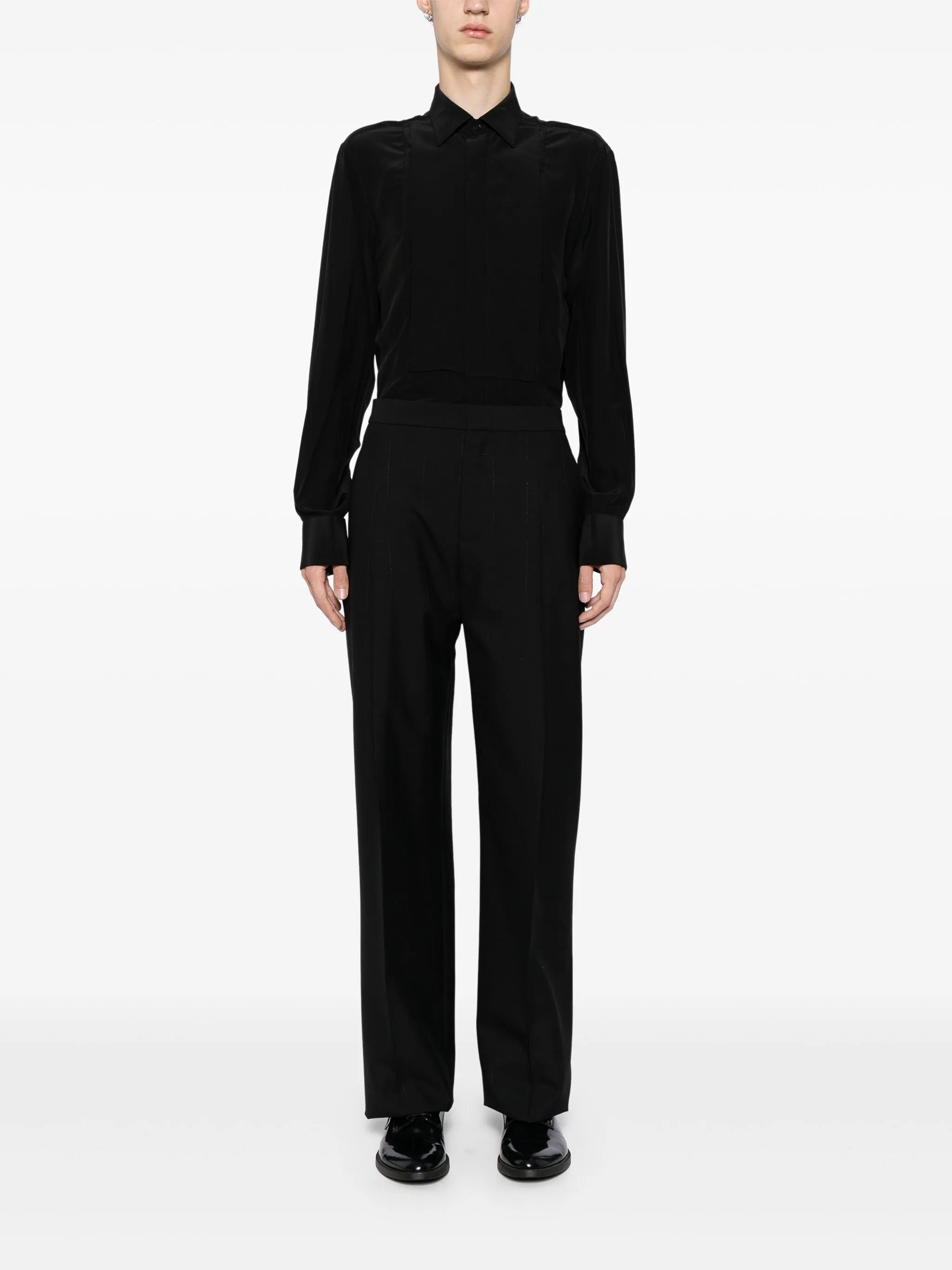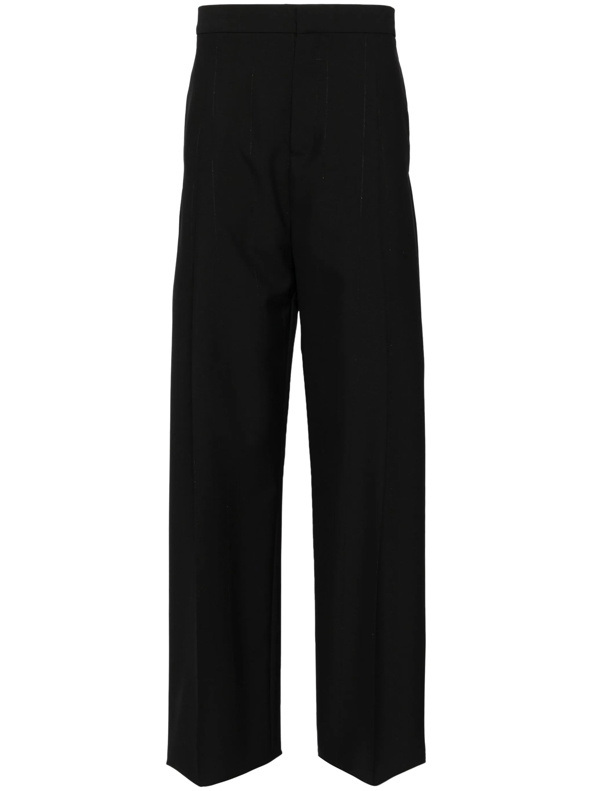 black wool blend pleat detailing hook and zip fly fastening two side inset pockets stitched pockets straight hem