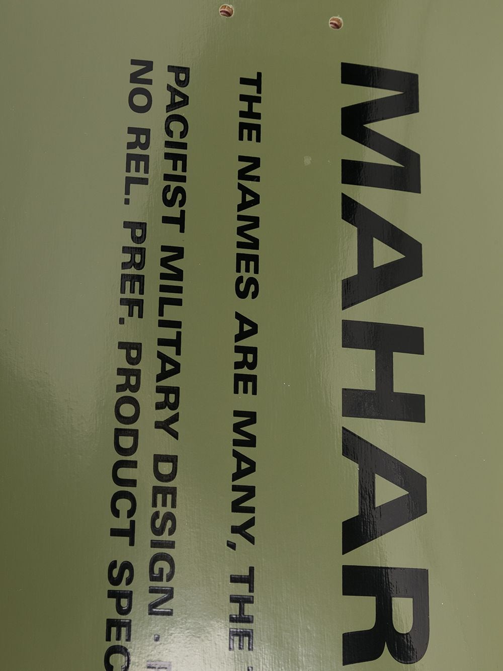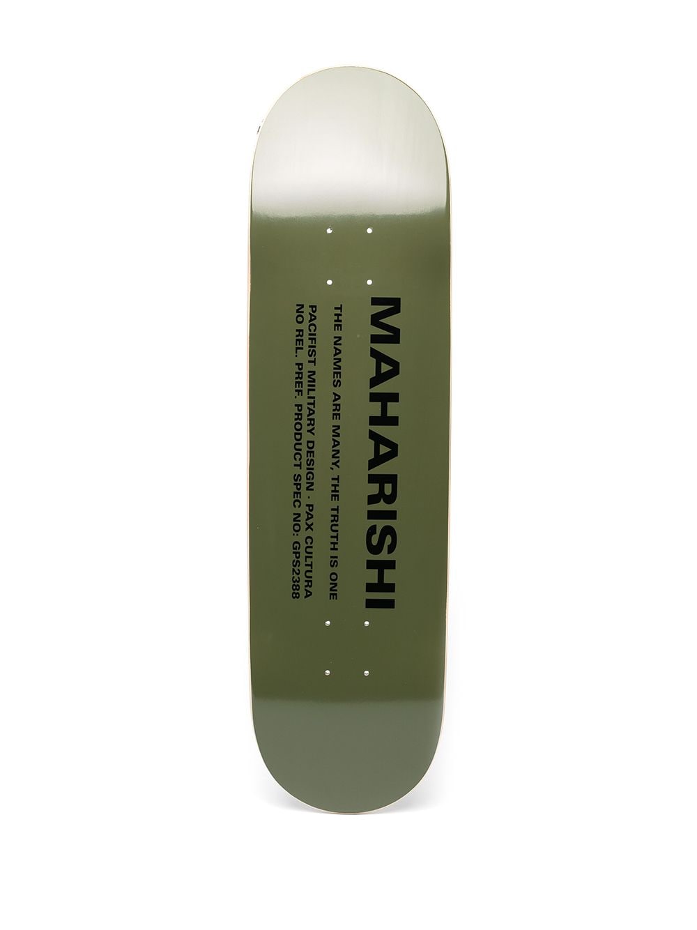 Blue/green Miltype wood skateboard from MAHARISHI featuring two-tone design, logo print to the rear and wood-grain effect.