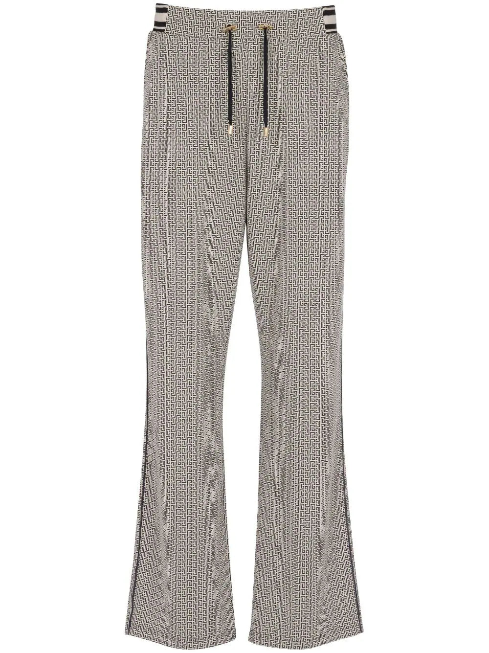 mini monogram-jacquard track pants from Balmain featuring black, beige, monogram jacquard, elasticated waistband, drawstring fastening waist, straight leg, two diagonal pockets to the sides and two rear button-fastening jetted pockets.
