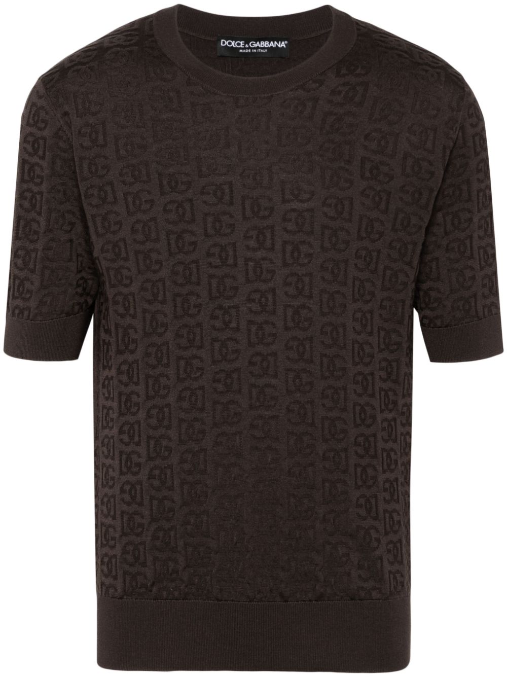 Introducing the Monogram-Jacquard T-Shirt, crafted with fine silk and intricately designed with a classic monogram jacquard pattern. The coffee brown color adds sophistication to this versatile piece, perfect for any occasion. Enjoy the comfort of the ribbed crew neck and short sleeves, finished with a straight hem.