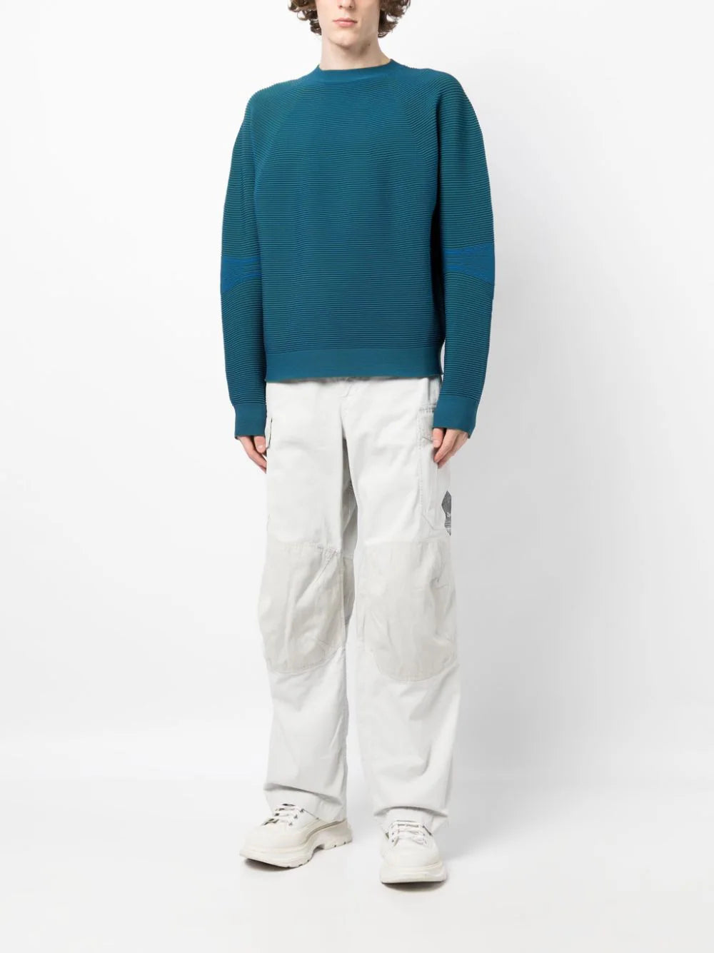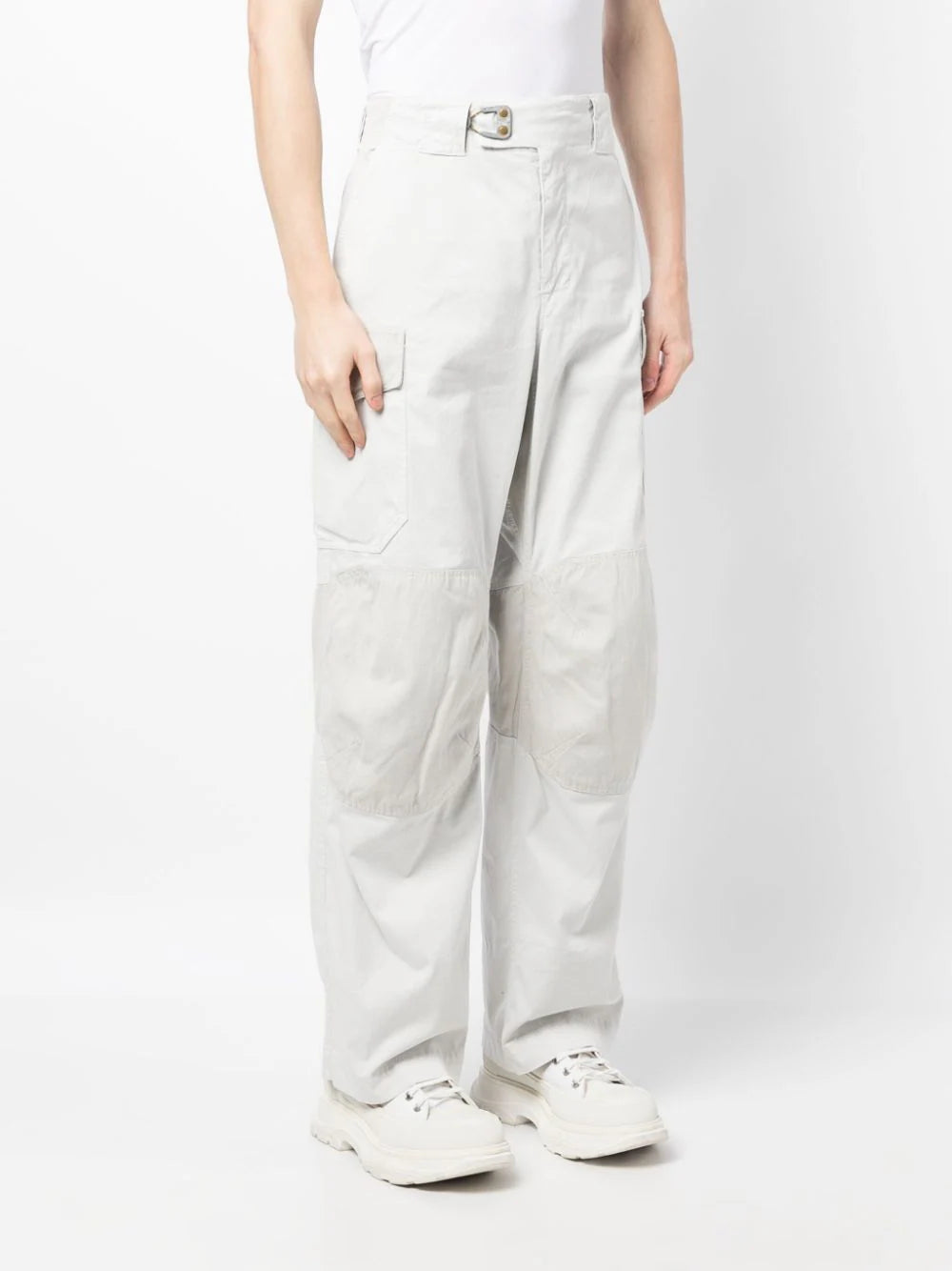 multi-pocket parachute pants from OBJECTS IV LIFE featuring light grey, stretch-cotton, belt loops, front button and zip fastening, straight leg, two side slit pockets, two side flap pockets and two rear welt pockets.