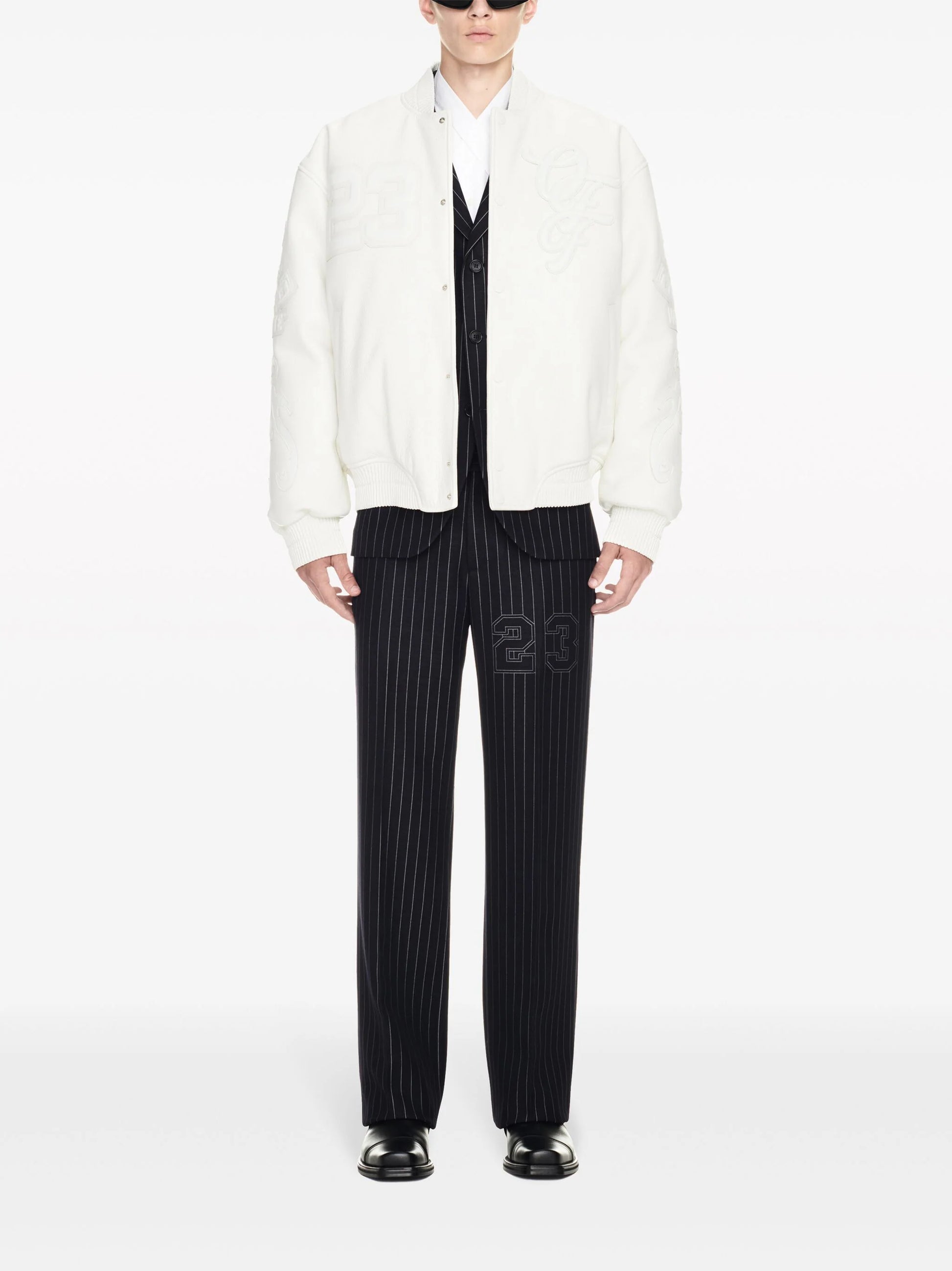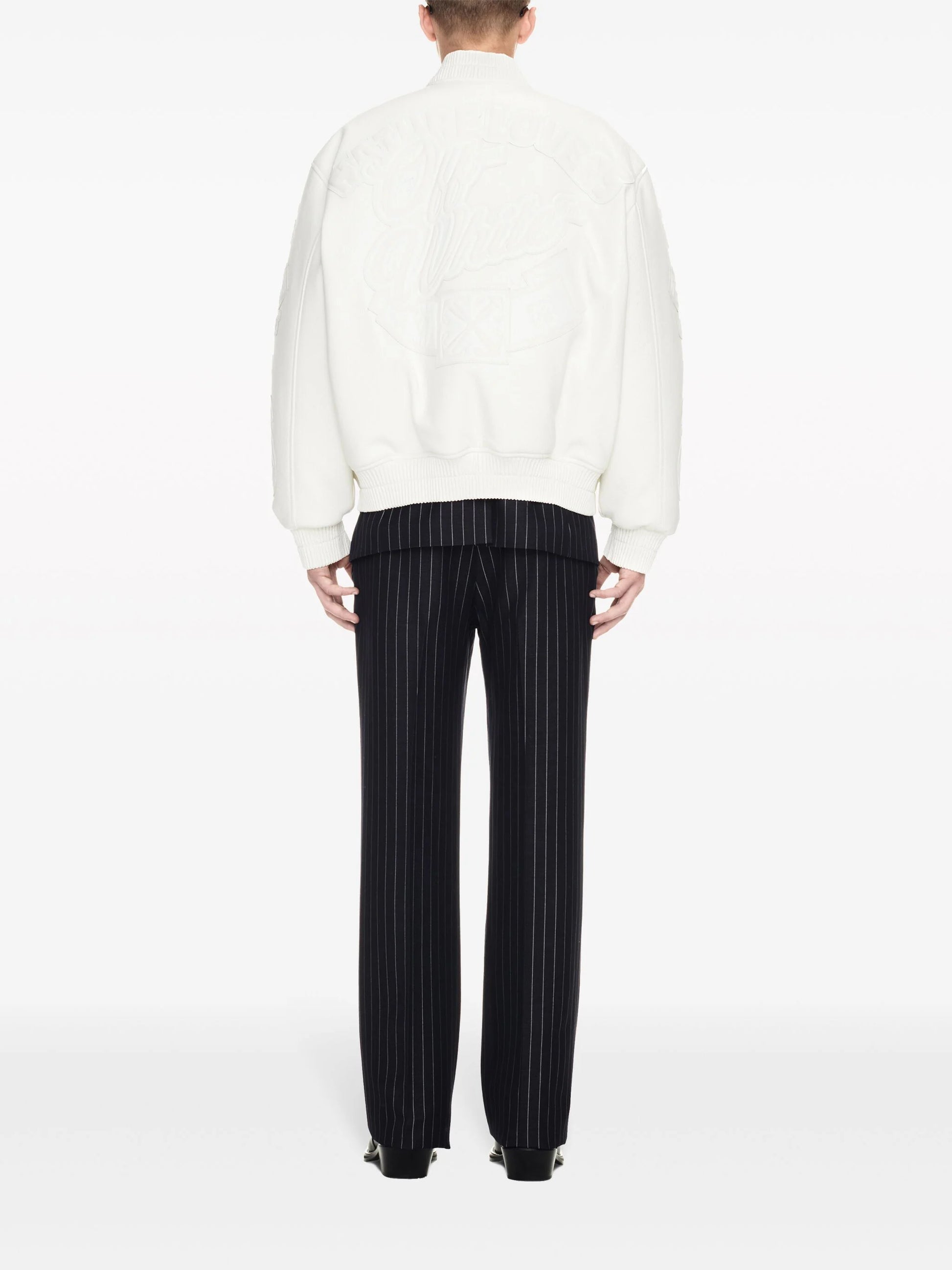 white cotton leather trim patch detail band collar long sleeves front press-stud fastening two side inset pockets straight hem ribbed cuffs and hem