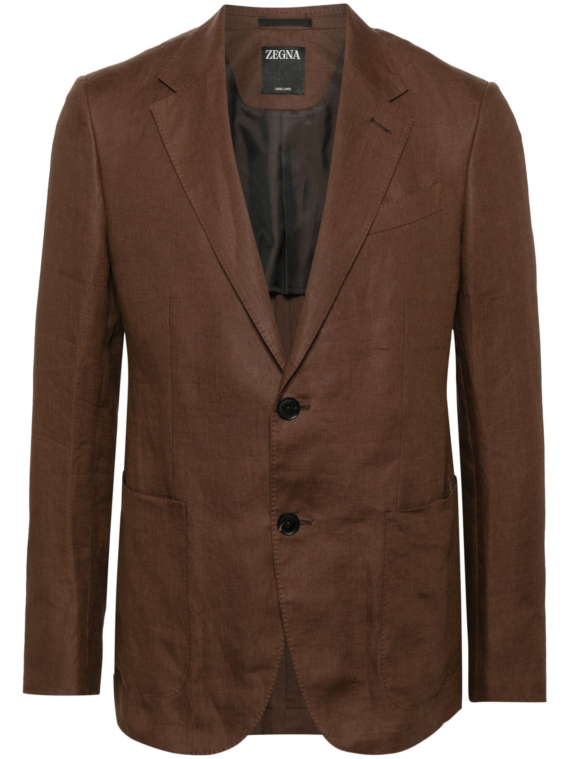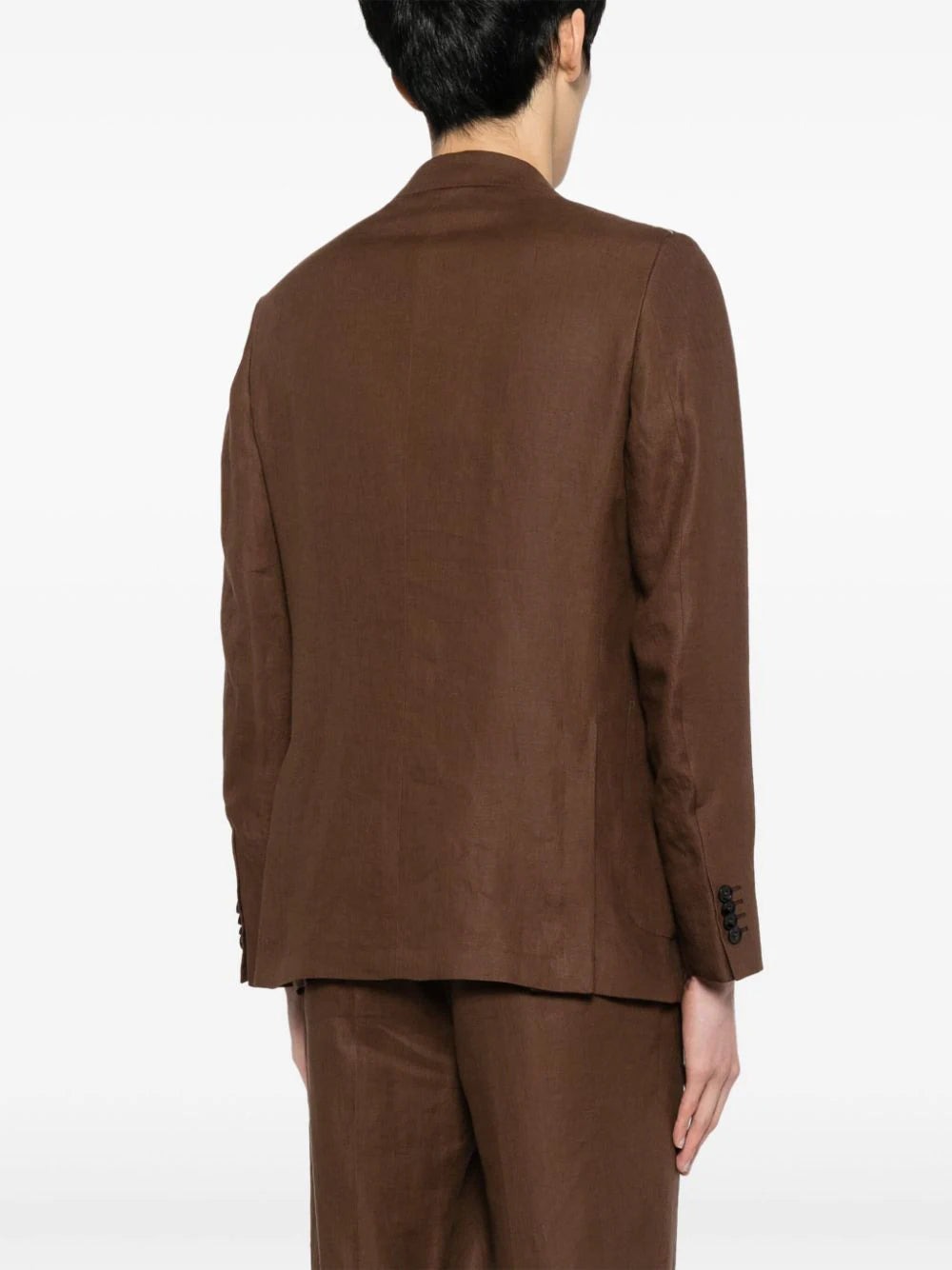 chocolate brown linen/flax notched lapels front button fastening two front patch pockets long sleeves buttoned-cuff sleeves curved hem