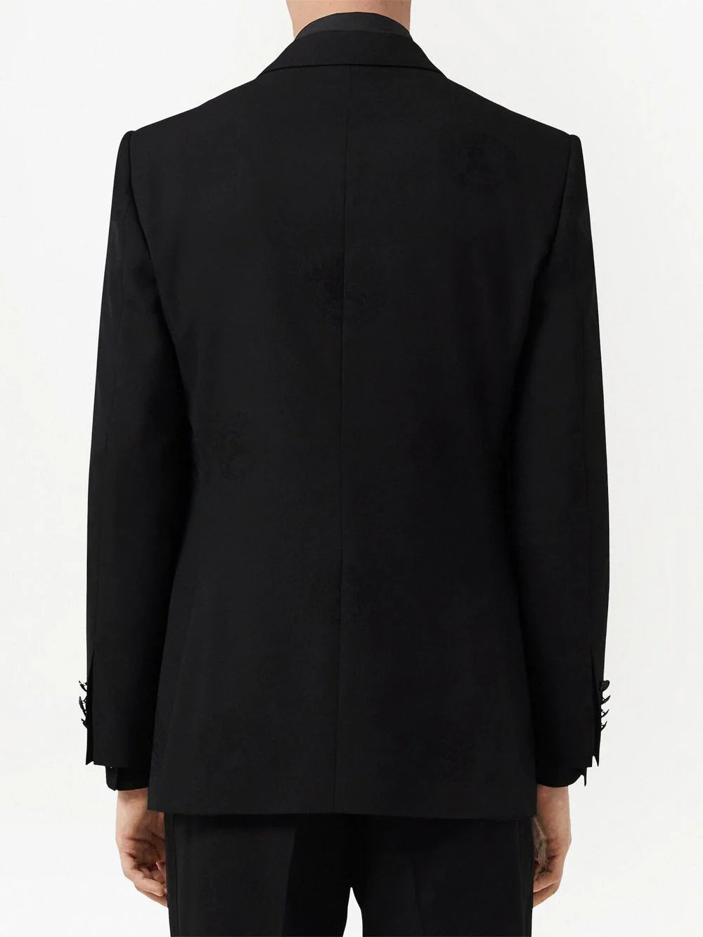 Oak Leaf Crest jacquard tuxedo jacket from BURBERRY featuring black, wool-cotton blend, linen, patterned jacquard, silk lapels, peak lapels, front button fastening, long sleeves, chest welt pocket, two side flap pockets and English rear vents.