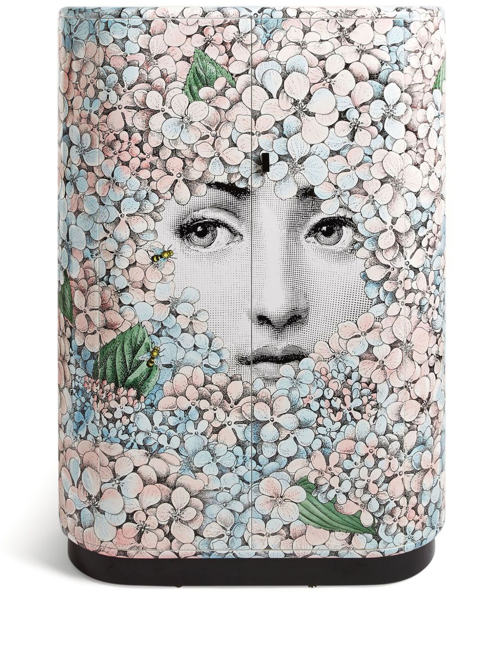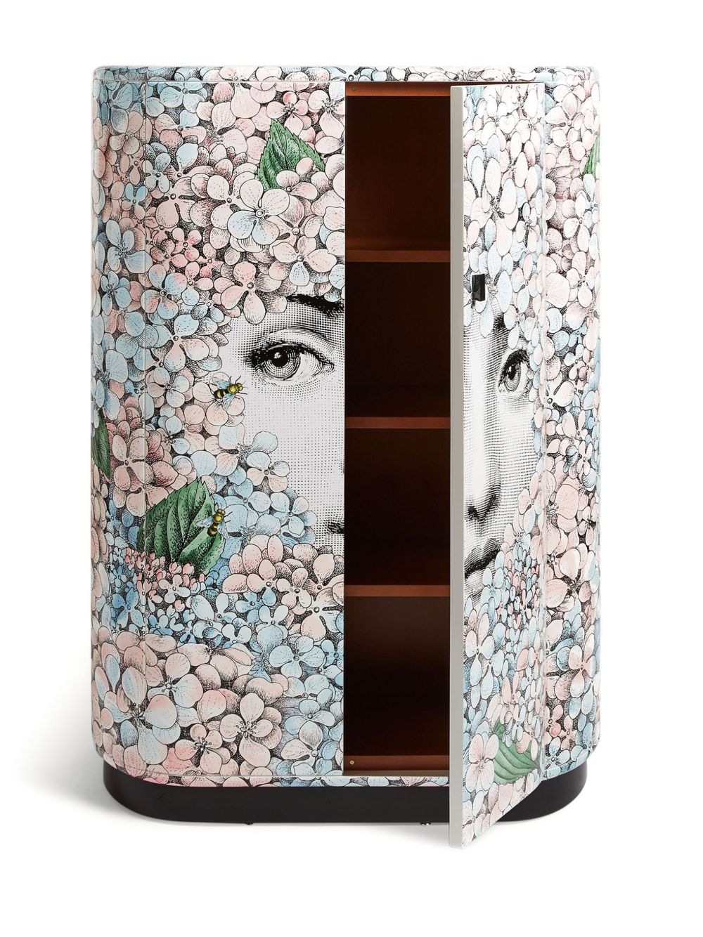 The Ortensia Cabinet boasts a stunning pink multicolour wood lacquered finish with a unique graphic print on the front. Its partitioned compartment adds functional organization to your living space. Elevate your home decor with this eye-catching piece.