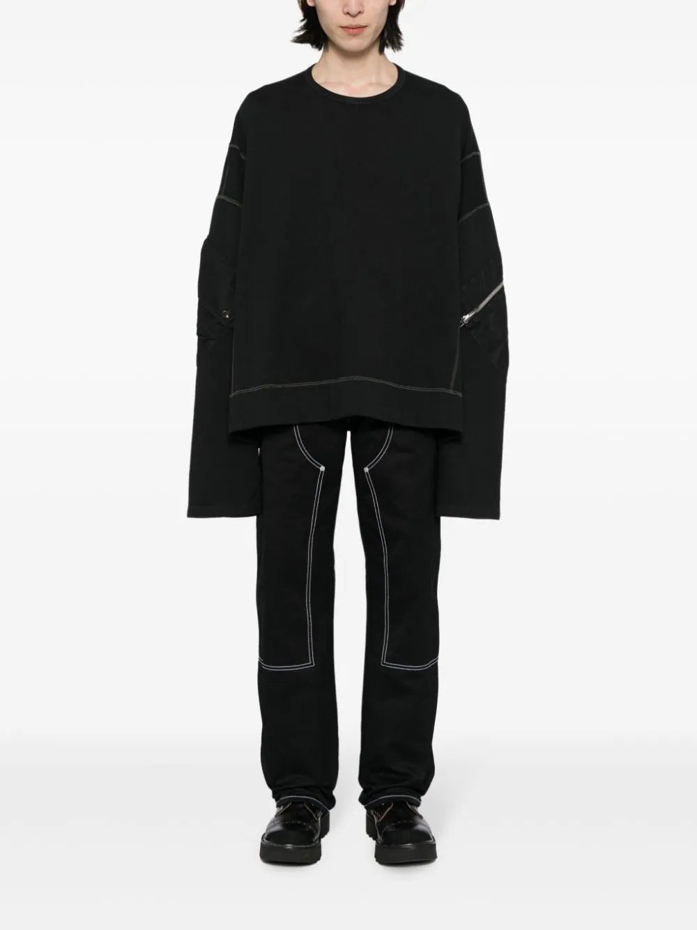 black cotton crew neck decorative zip detailing drop shoulder extra-long sleeves straight hem