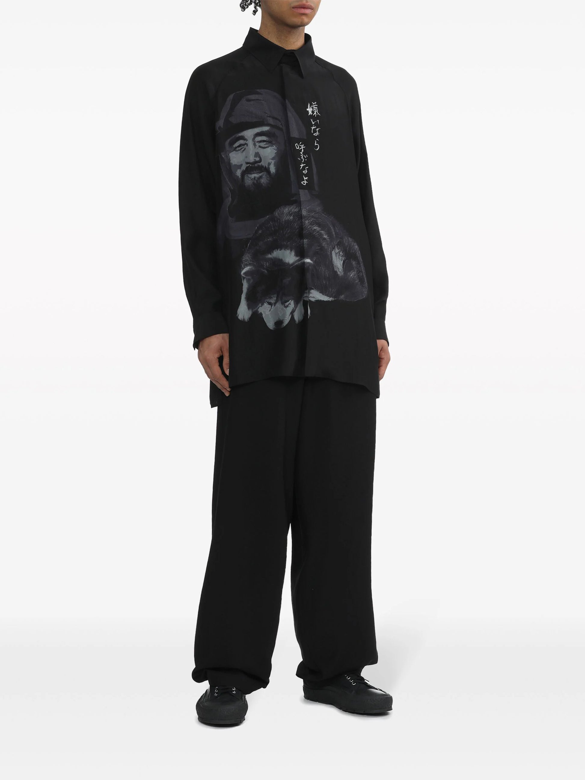 black/grey silk graphic print to the front classic collar concealed front fastening long sleeves