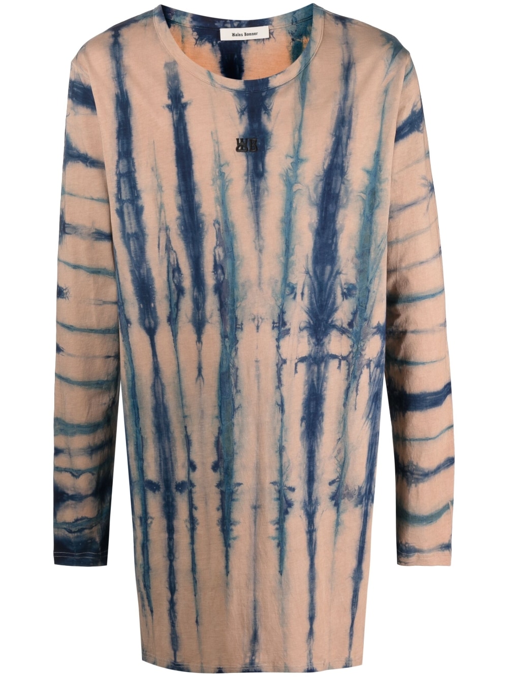 oversized tie-dye T-shirt from Wales Bonner featuring beige, blue, organic cotton, tie-dye pattern, round neck, long sleeves, long length and straight hem. This item is made from at least 50% organic materials..