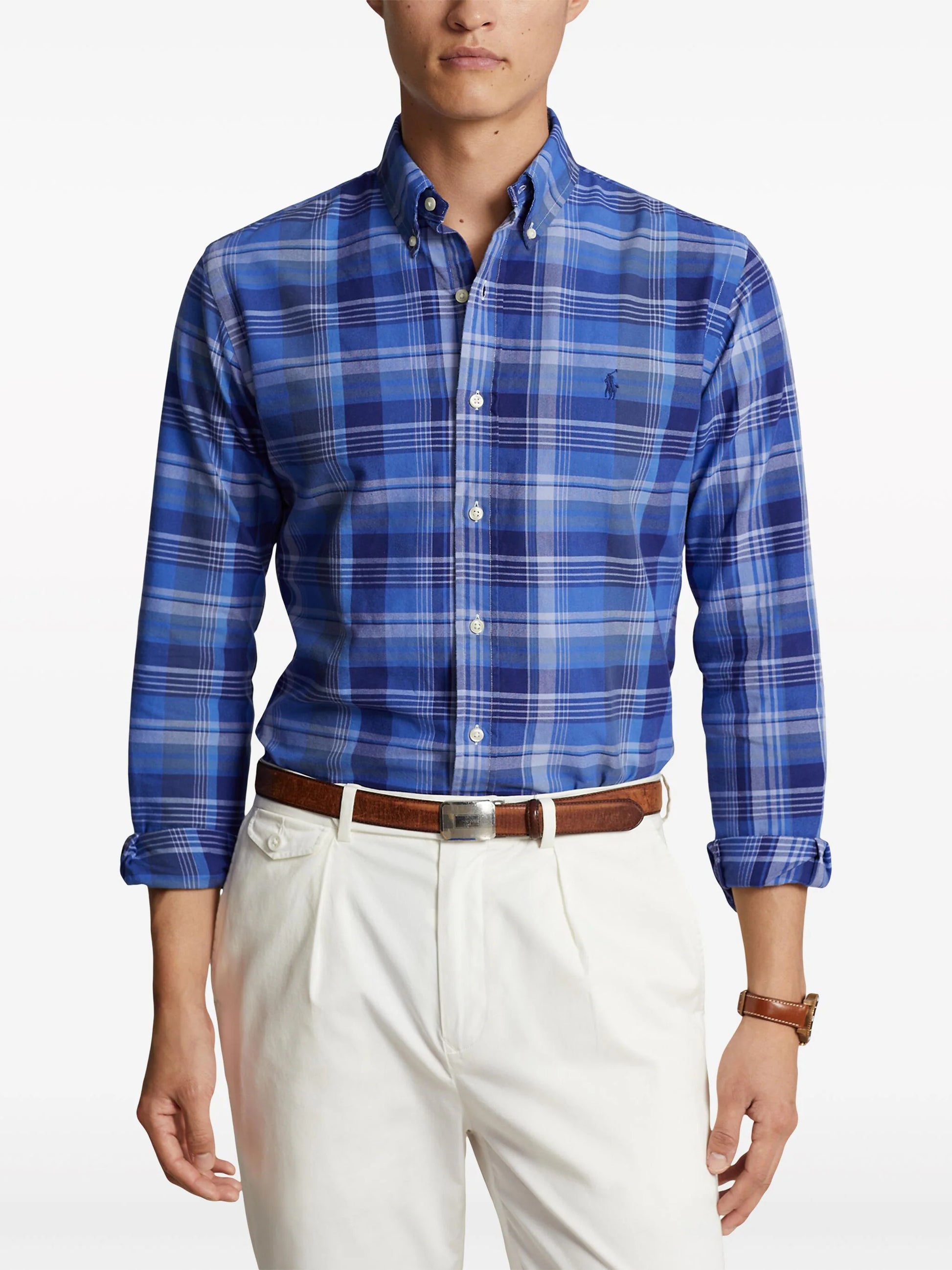 oxford blue/multicolour cotton plaid check print embroidered logo at the chest signature Polo Pony motif button-down collar front button fastening shirt sleeves buttoned cuffs curved hem