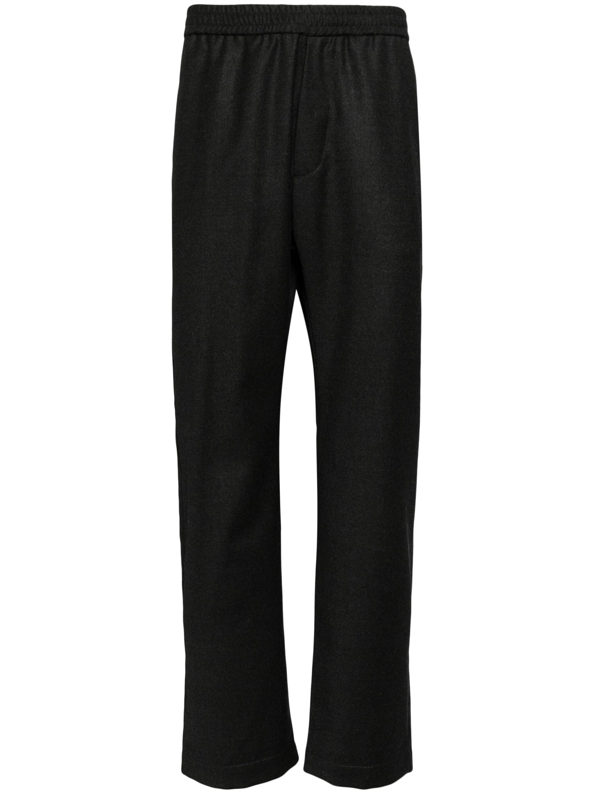 anthracite wool blend twill weave elasticated waistband with internal drawstring two side slit pockets two rear patch pockets straight leg straight hem