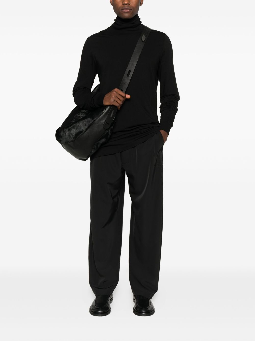 These black pants feature a wide-leg silhouette paired with an elasticated waistband for effortless comfort and fit. Accented with a subtle logo detail, they blend relaxed style with expert tailoring, making them a versatile choice for both casual and refined outfits.