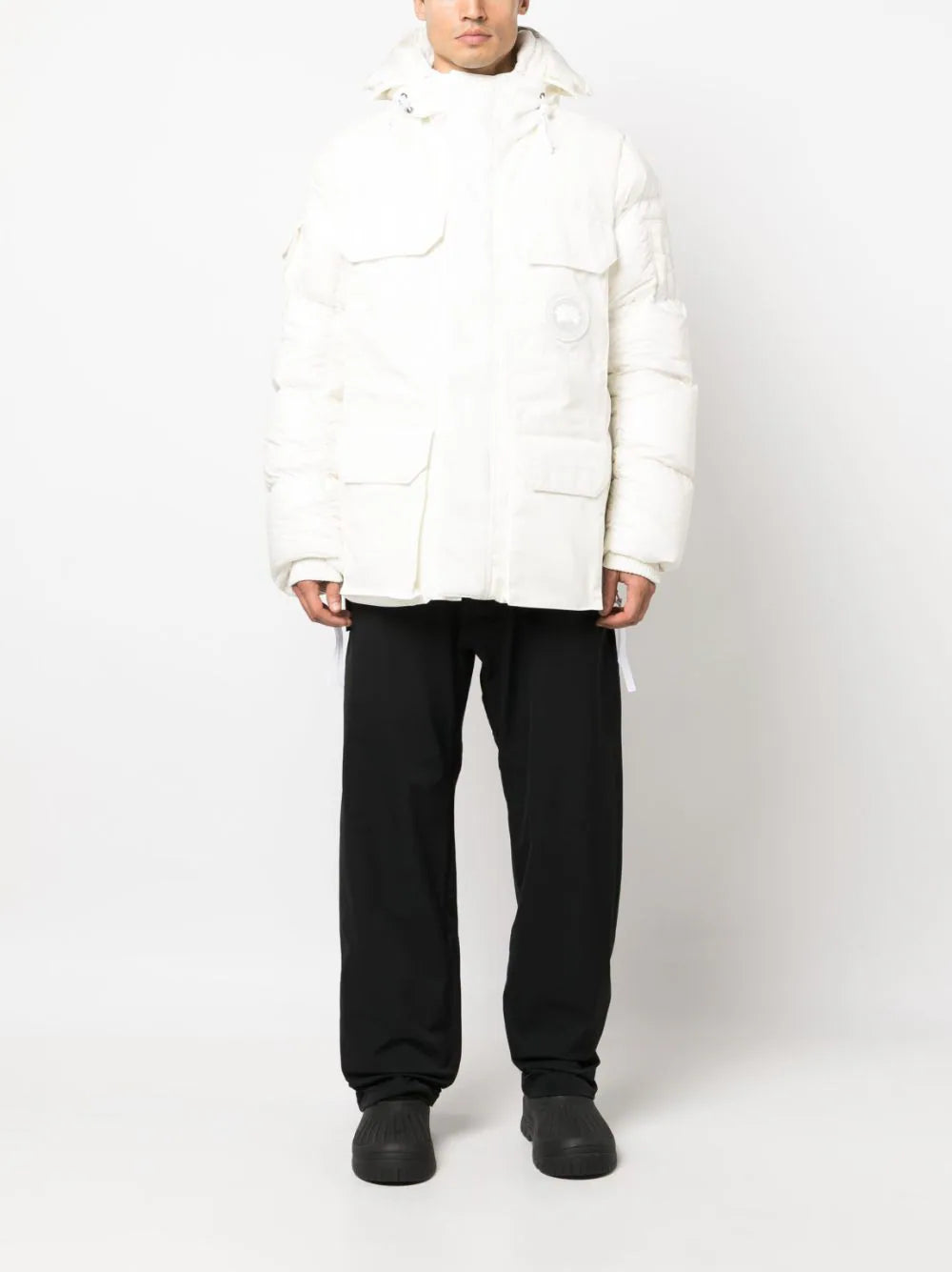 Paradigm Expedition hooded padded jacket from CANADA GOOSE featuring white, duck down, padded design, ribbed cuffs, logo patch to the front, classic hood, concealed front fastening, long sleeves, logo shoulder strap, two chest flap pockets, two front flap pockets and straight hem.