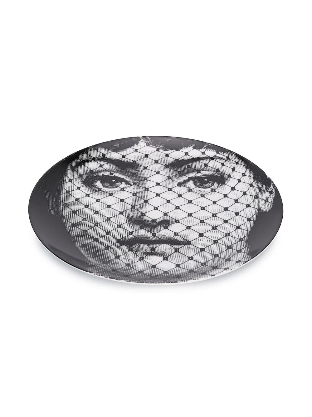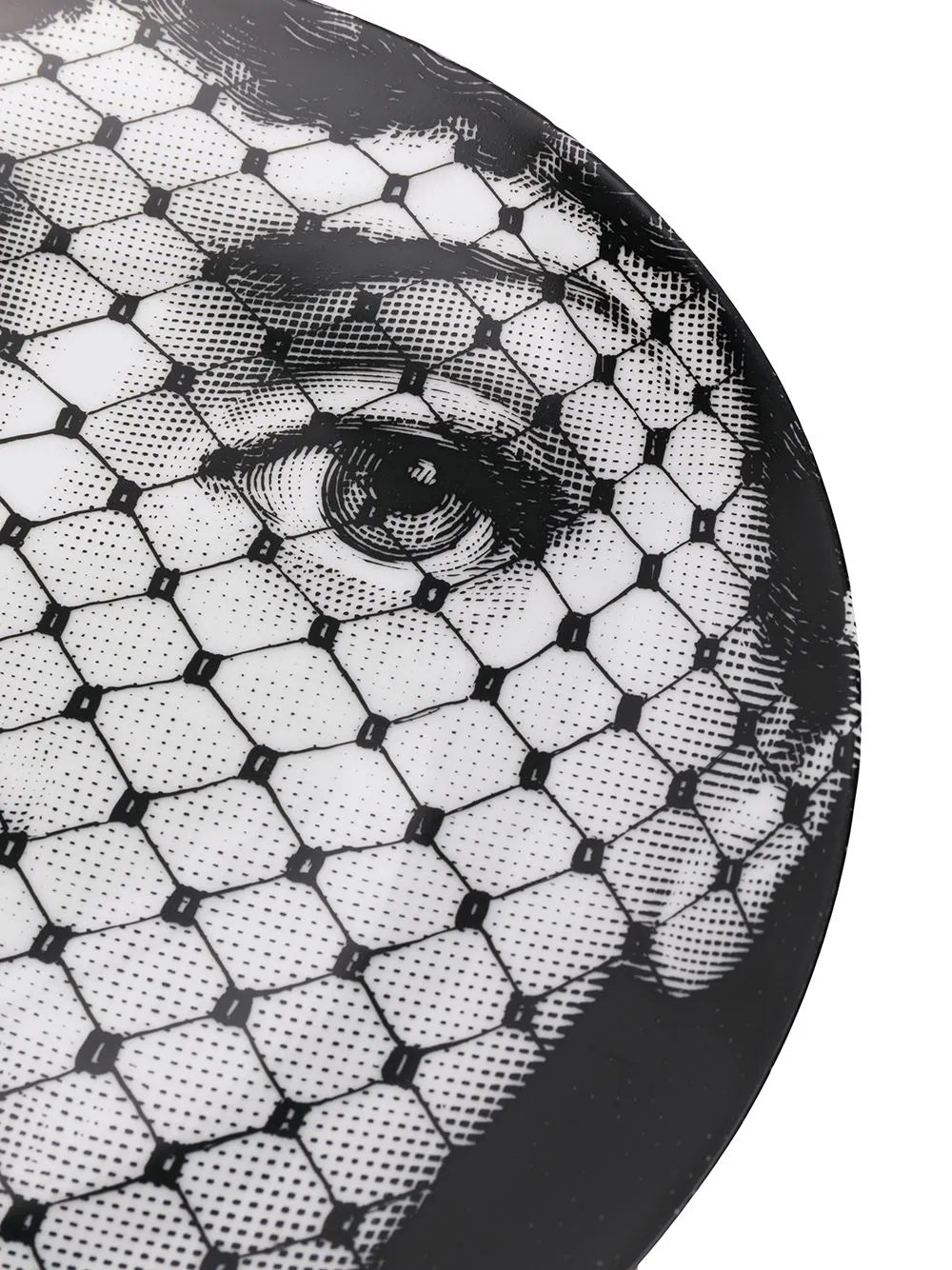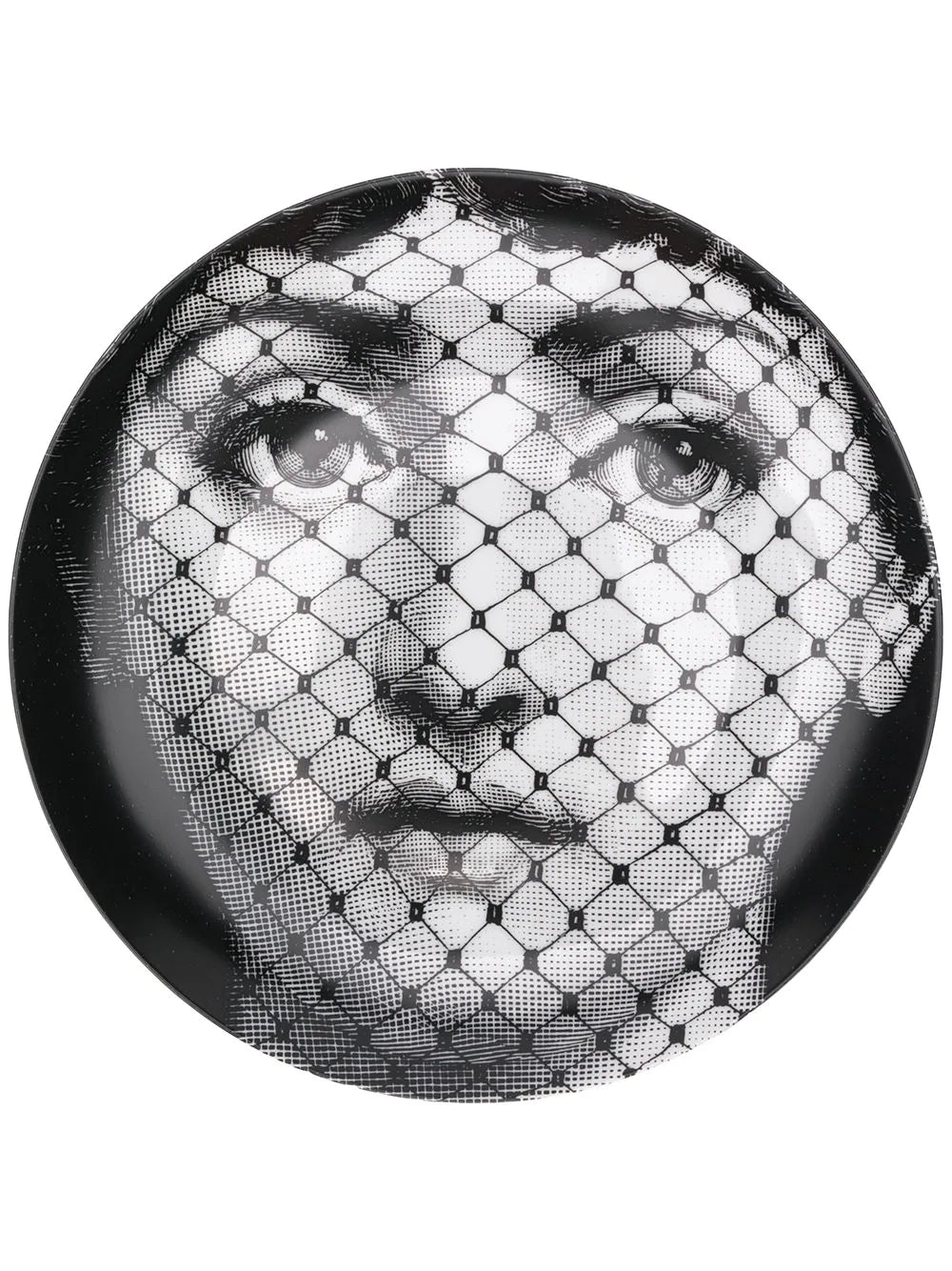 White ceramic patterned decorative plate from Fornasetti featuring a round body and a print to the front. This item comes with a gift box.