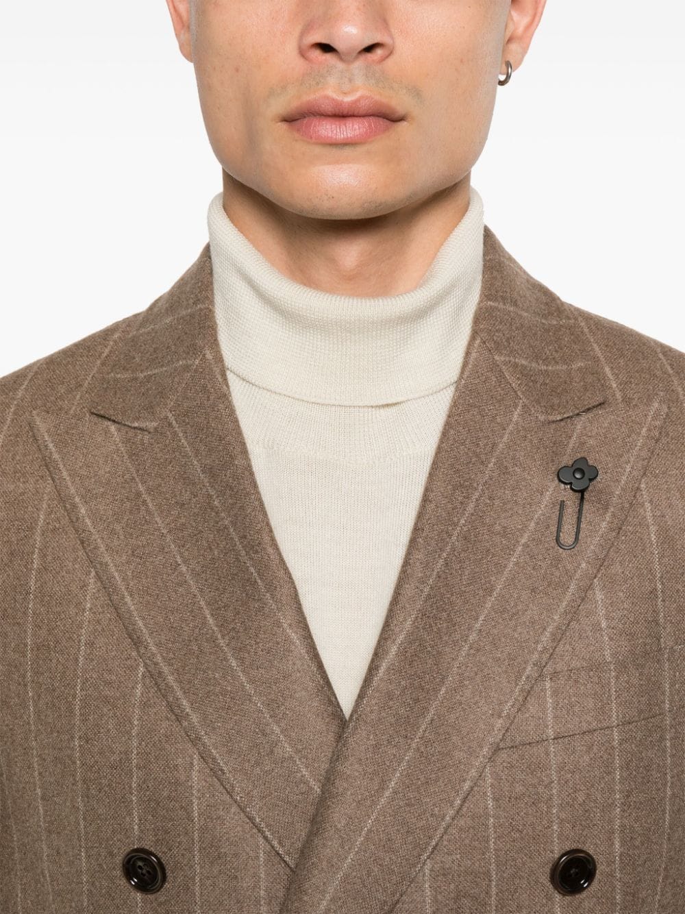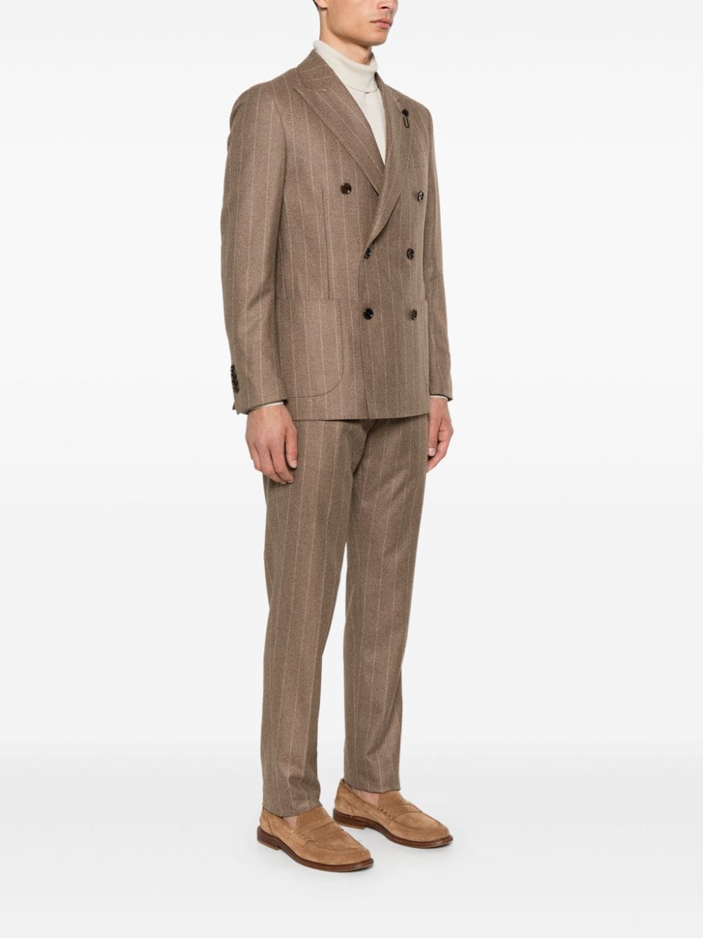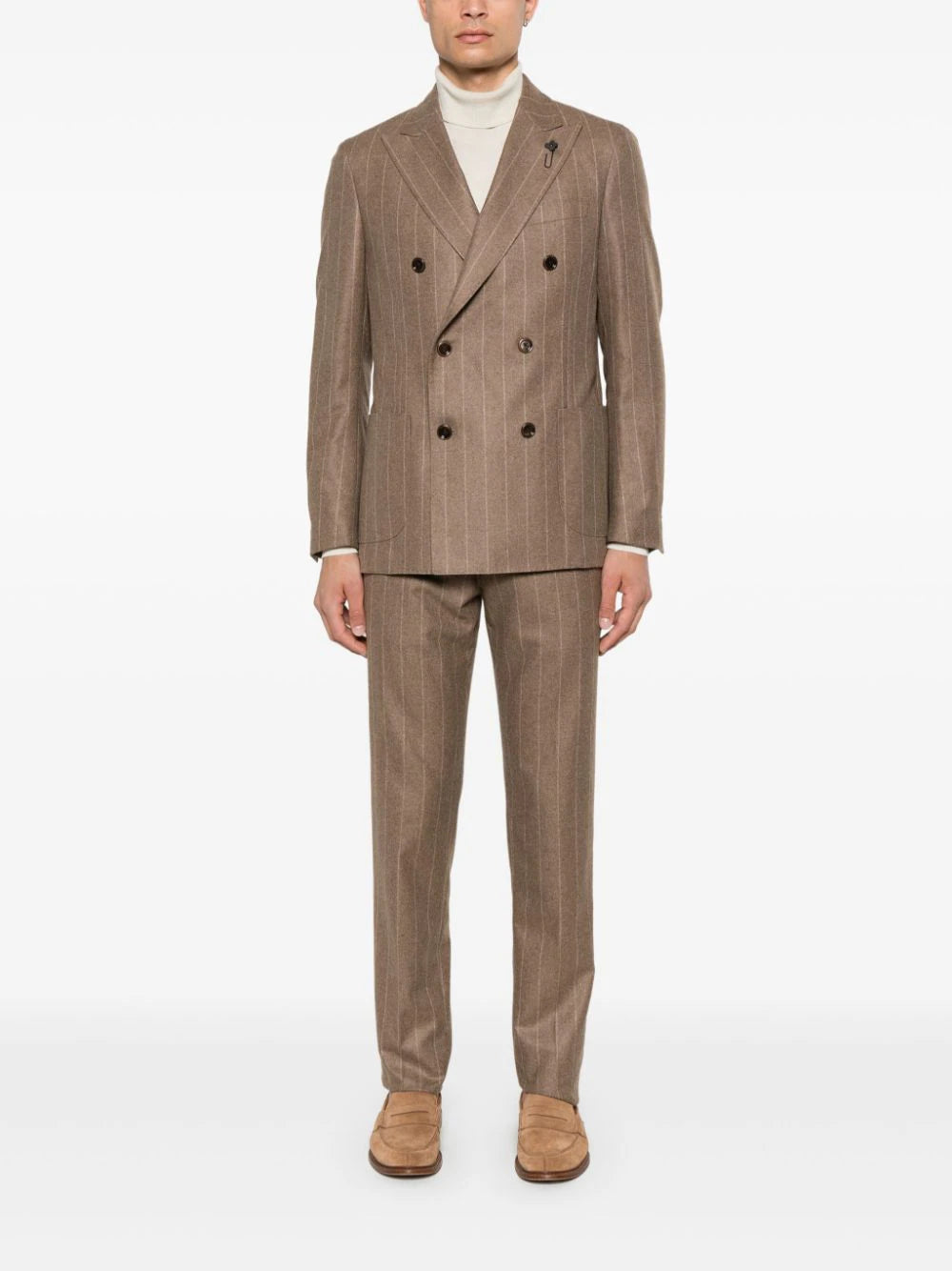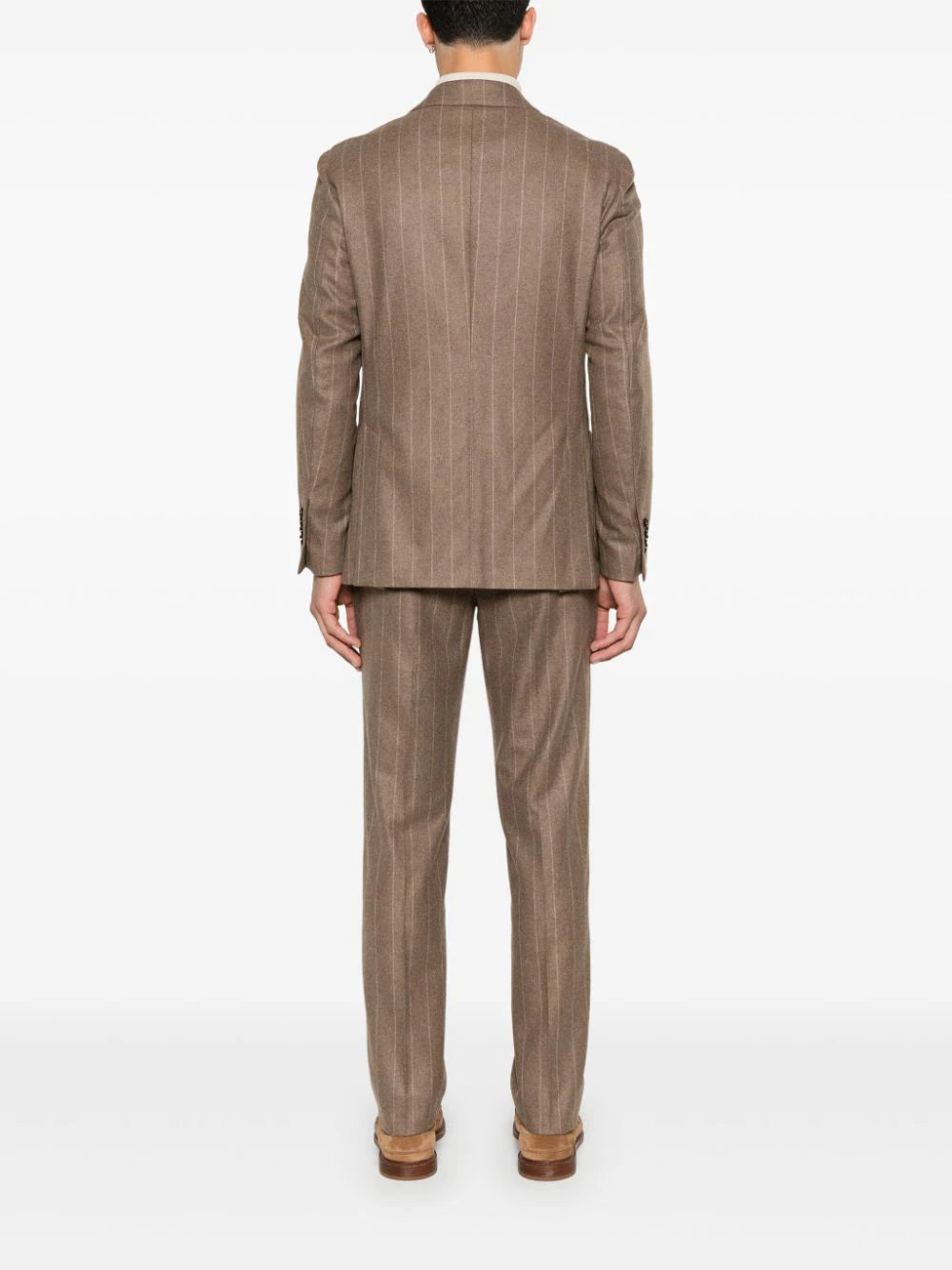 light brown cashmere pinstripe pattern Blazer double-breasted button fastening peak lapels brooch detail long sleeves buttoned cuffs chest welt pocket dart detailing two front patch pockets English rear vents straight hem Trousers concealed front button, hook and zip fastening belt loops two diagonal pockets to the sides pressed crease two rear button-fastening jetted pockets tapered leg
