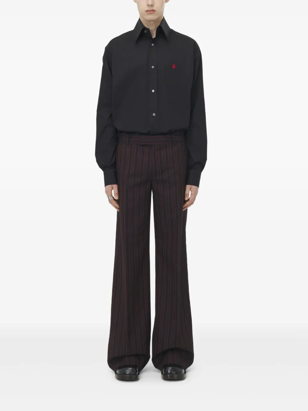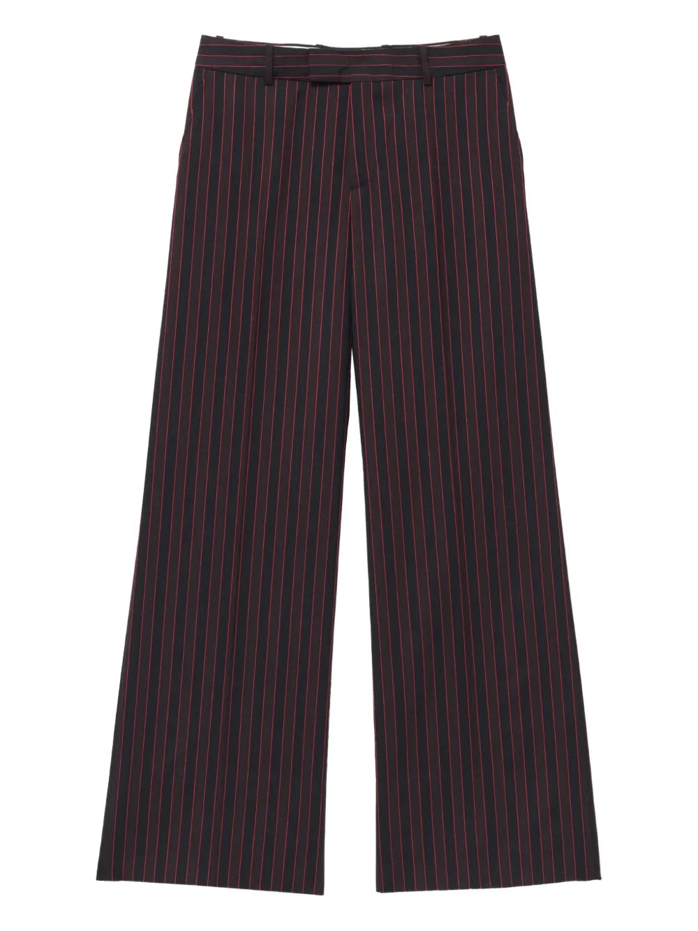 These Pinstripe Tailored Trousers are expertly crafted with a concealed front fastening, belt loops, and a timeless pinstripe pattern. The wide leg design provides a comfortable yet stylish fit, making these trousers perfect for any professional setting. Elevate your wardrobe with these must-have trousers.