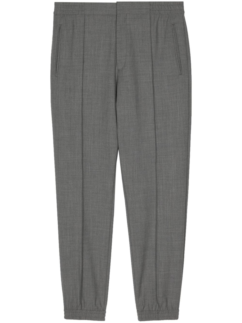 grey wool blend pleat detailing mid-rise elasticated waistband concealed front fastening two side welt pockets two rear welt pockets slim cut