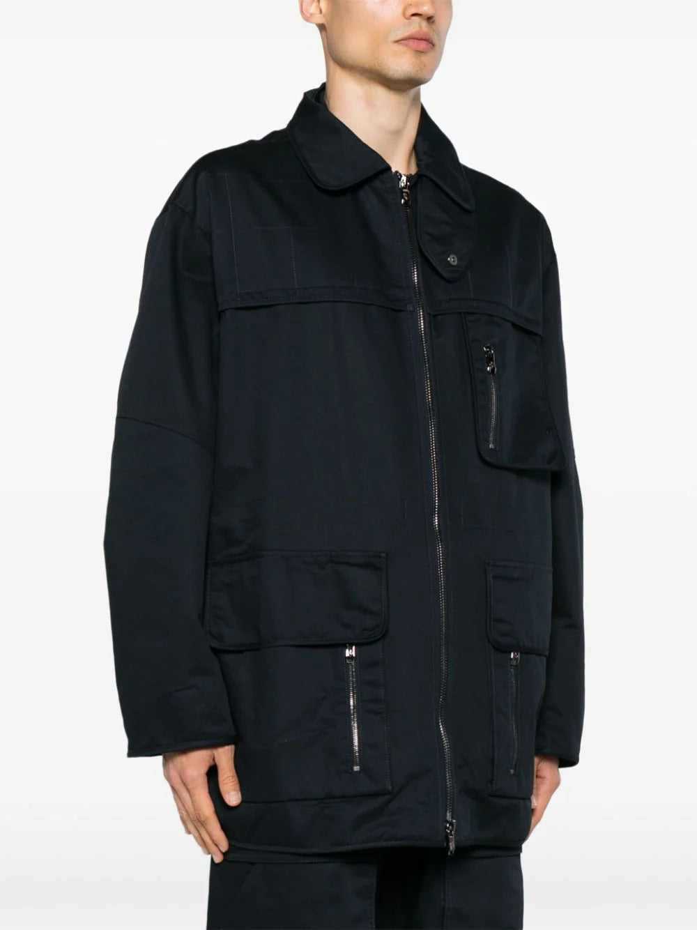 navy blue cotton twill weave quilted spread collar throat latch front two-way zip fastening long sleeves ribbed cuffs zip-fastening chest pocket two side cargo pockets two side zip-fastening pockets two diagonal pockets to the sides logo-jacquard lining straight hem