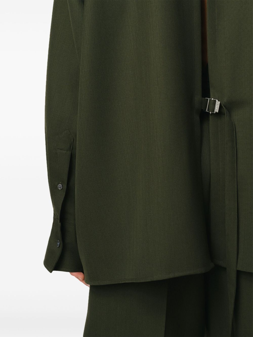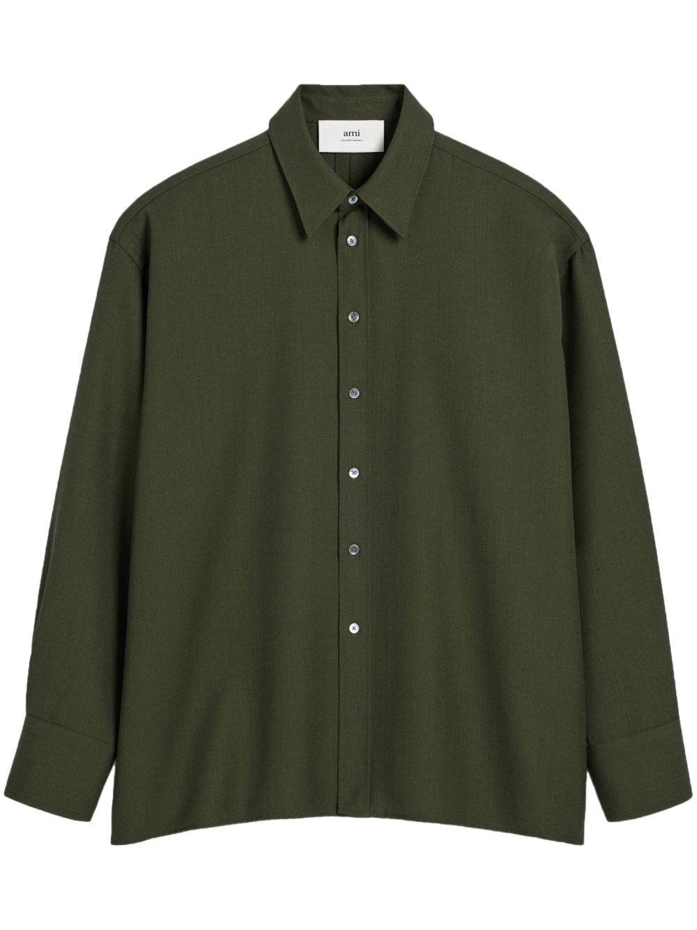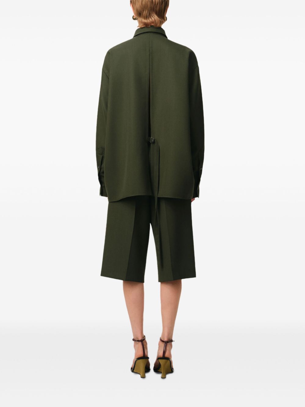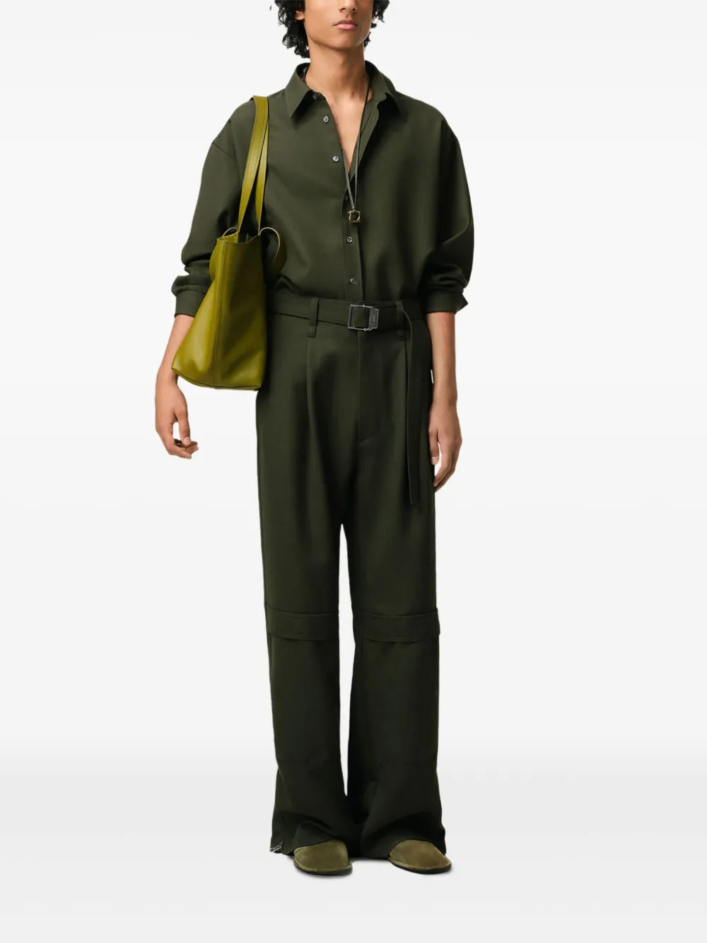 This Rear-Slit Shirt features a green front button fastening, buttoned cuffs, and a classic collar. It is a unisex item graded in standard men's sizing, providing a versatile and comfortable fit for all. A stylish addition to any wardrobe with its sleek design and practical features.