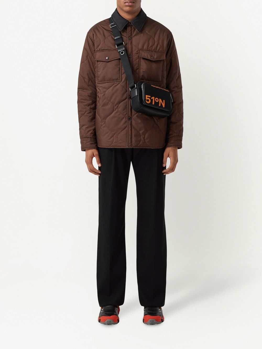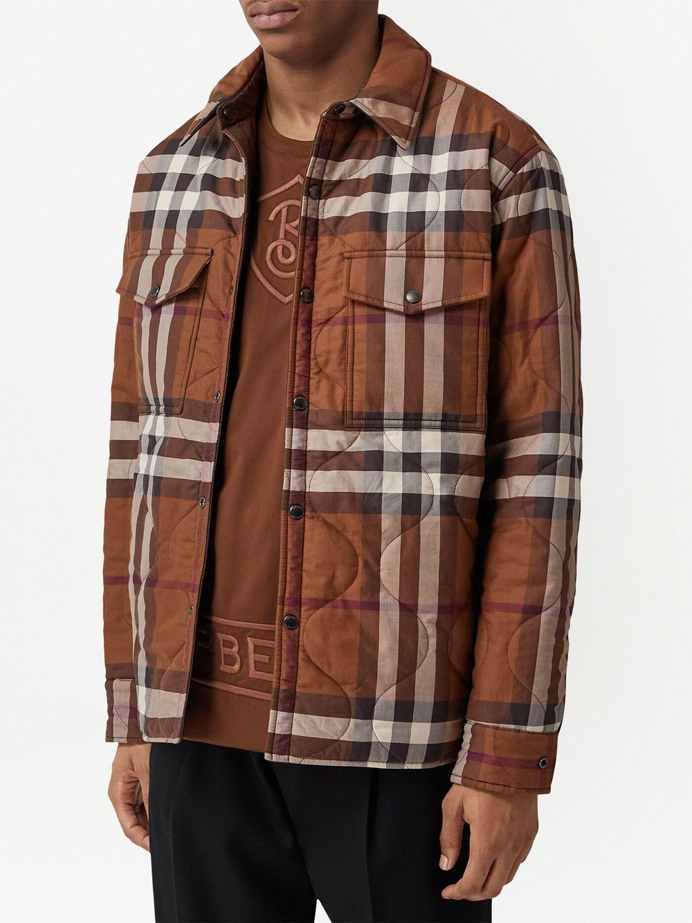 reversible checked quilted overshirt from BURBERRY featuring brown, padded design, quilted finish, embroidered logo at the chest, contrasting collar, front press-stud fastening, long sleeves, two stud-fastening chest pockets, reversible and checked lining.