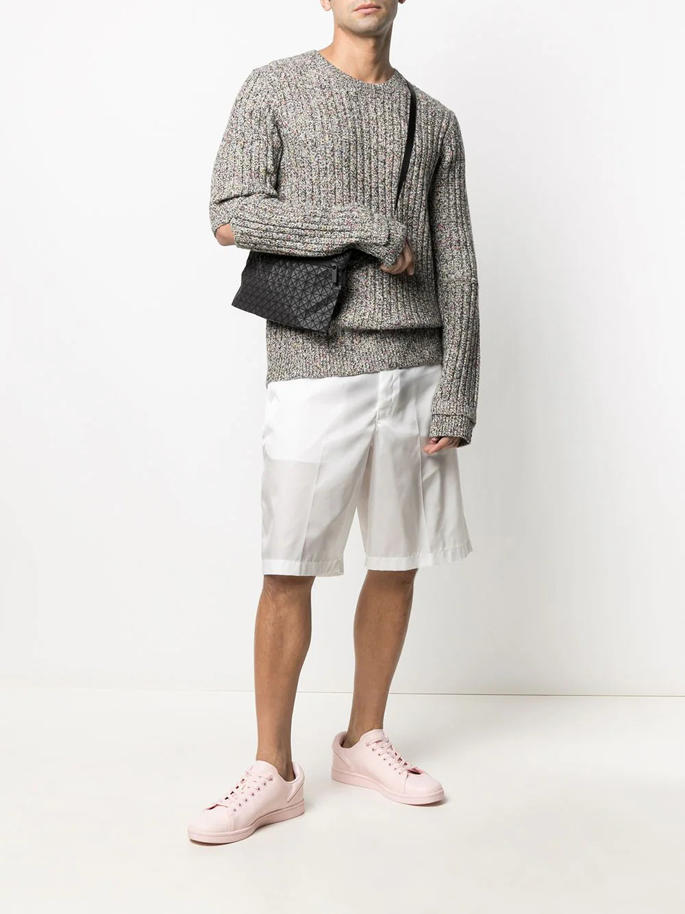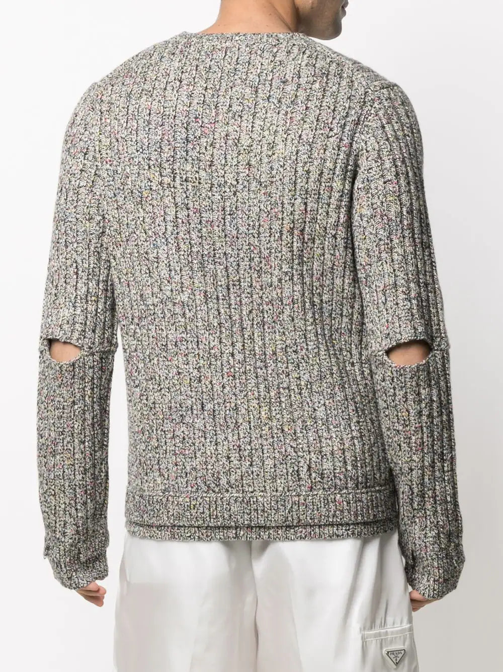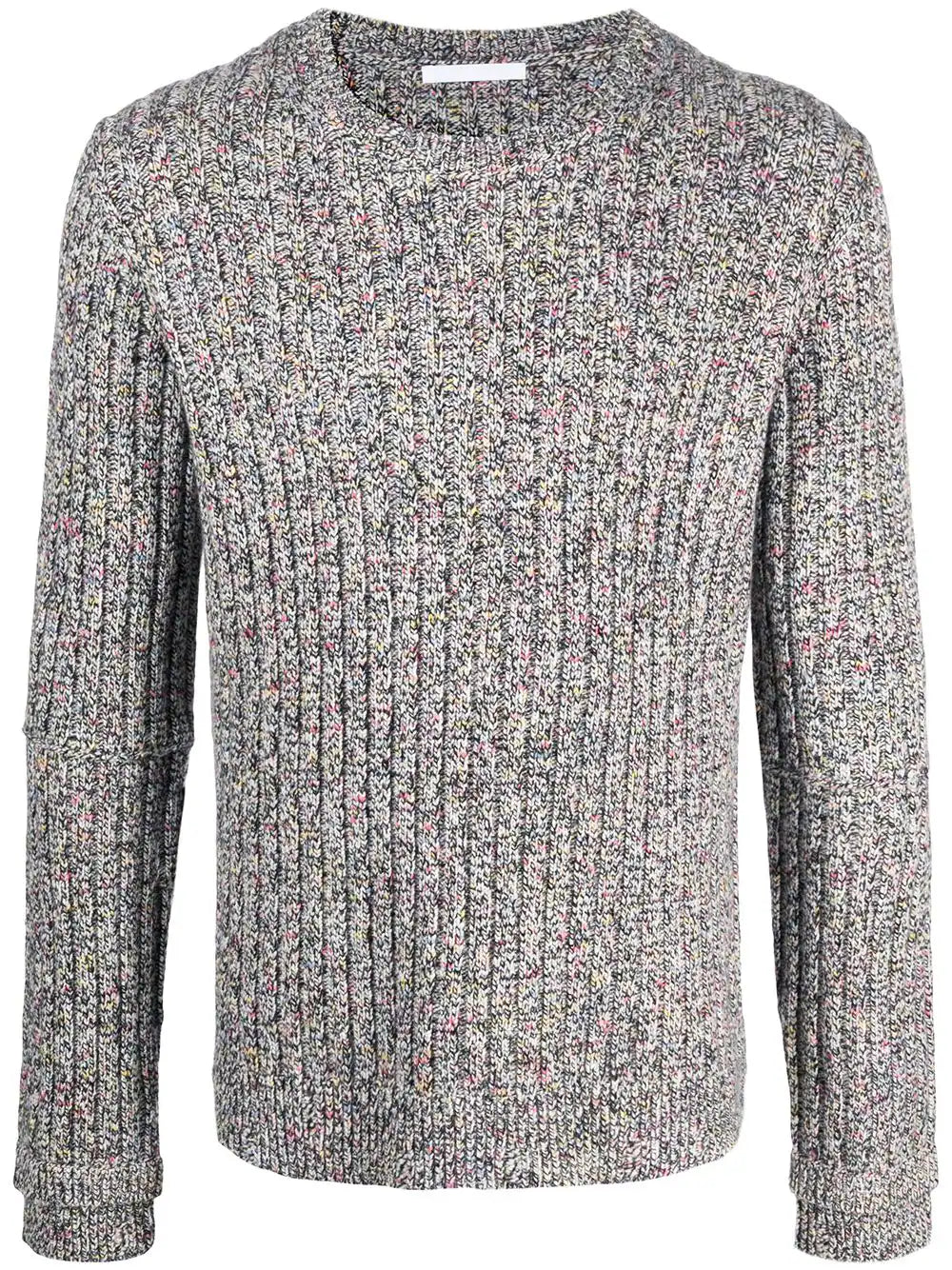 Basalt black/multicolour wool-cashmere-cotton blend ribbed speckle knit jumper from HELMUT LANG featuring ribbed knit, crew neck, long sleeves and slit sleeve detailing.