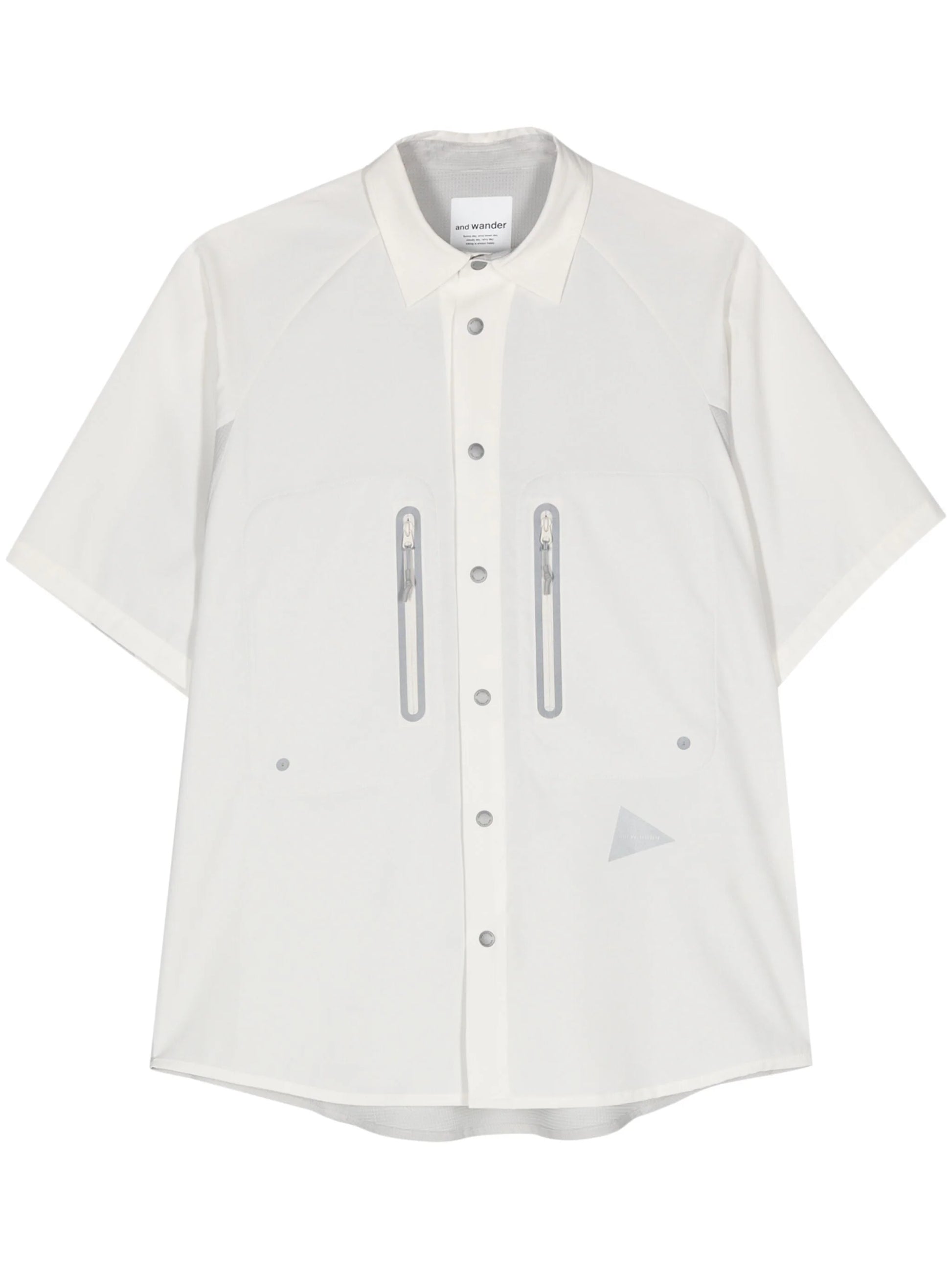 white/light grey panelled design ripstop texture panels classic collar short sleeves two zip-fastening chest pockets reflective detailing curved hem front press-stud fastening