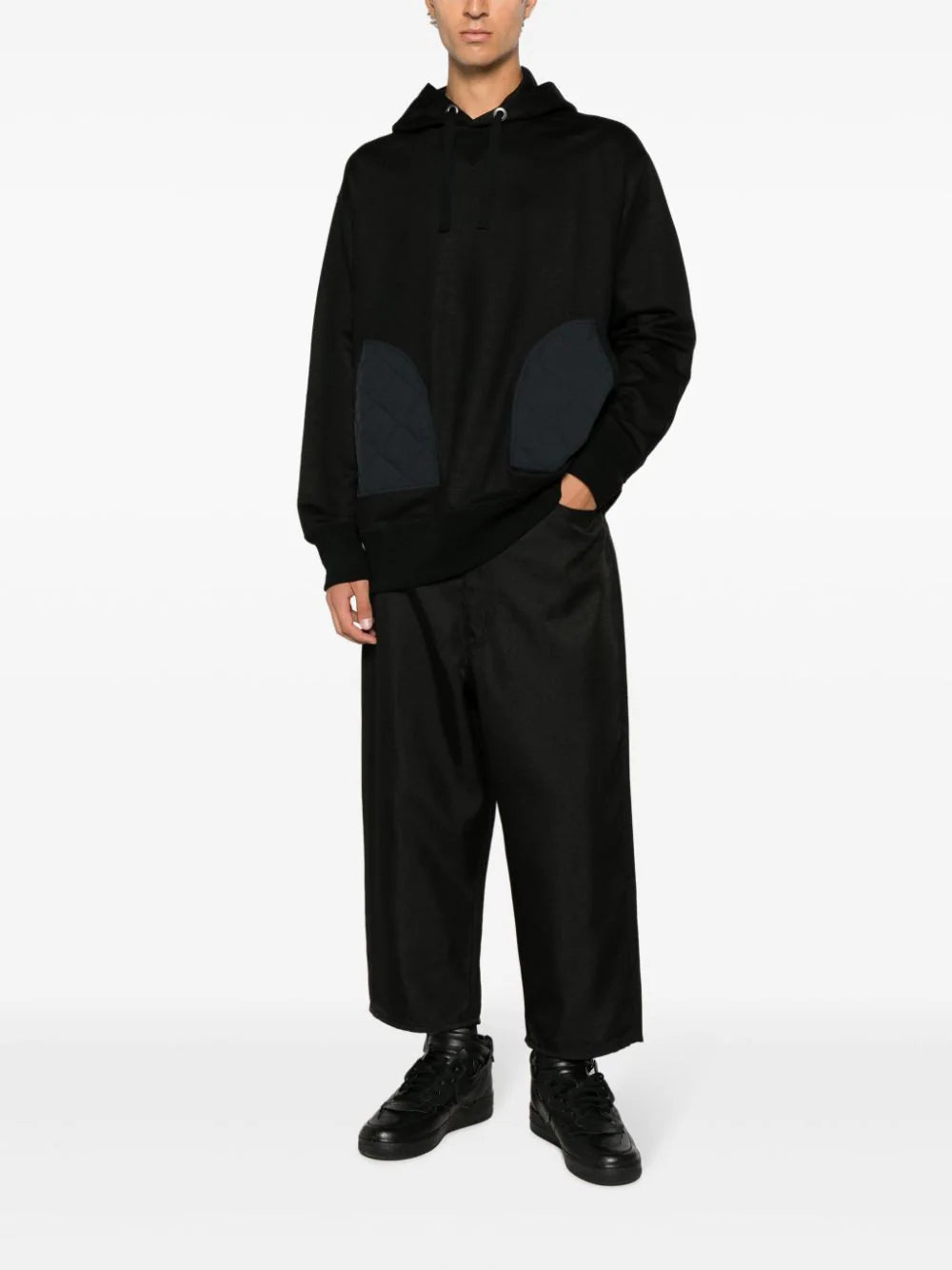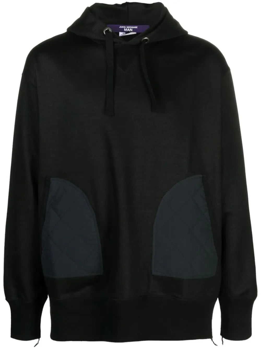 black cotton jersey texture ripstop texture contrasting panel detail drawstring hood drop shoulder long sleeves two front pouch pockets ribbed cuffs and hem