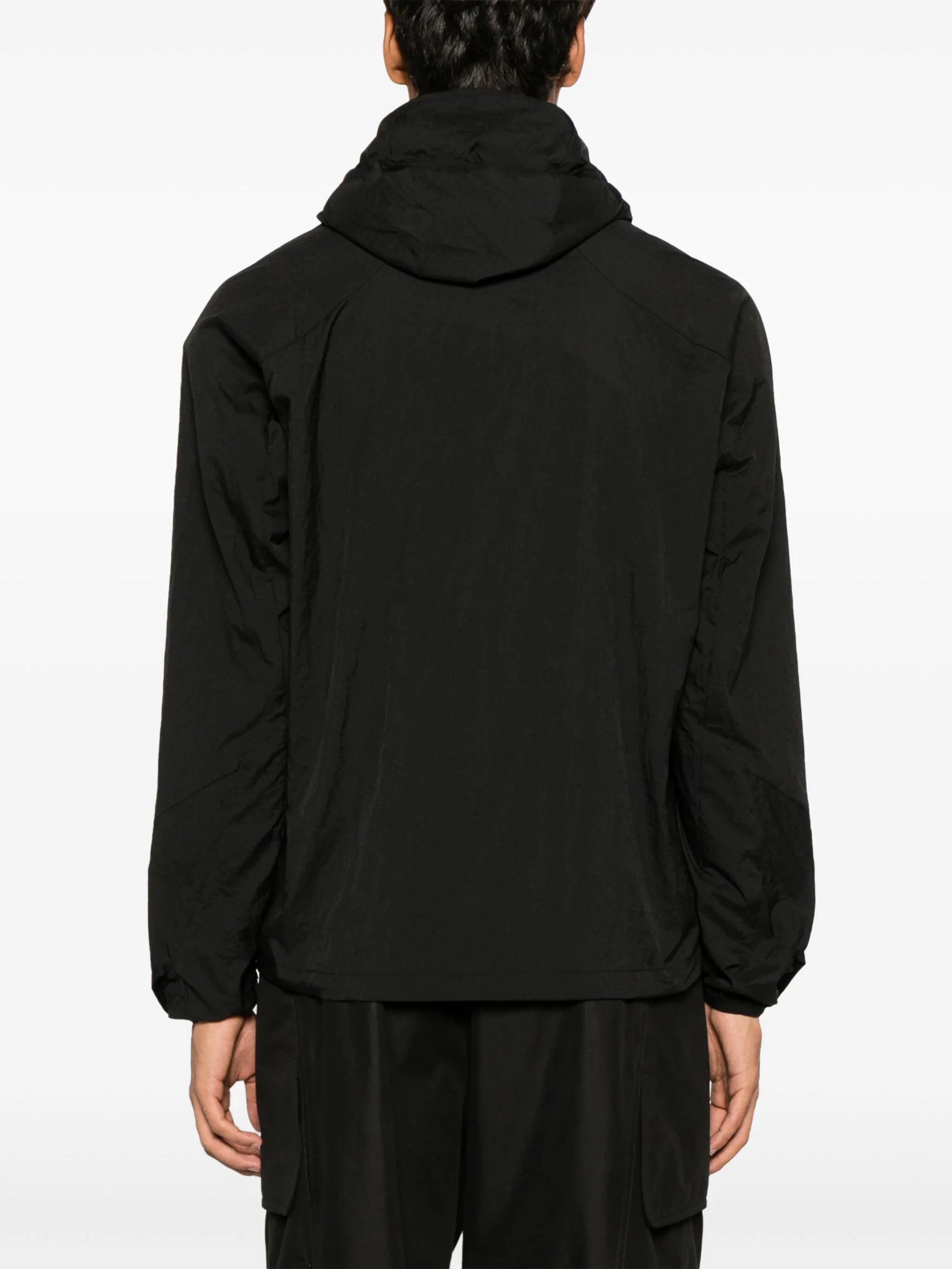 black lightweight ripstop texture water-resistant drawstring hood front zip fastening two side inset pockets elasticated drawstring waistband bonded seams