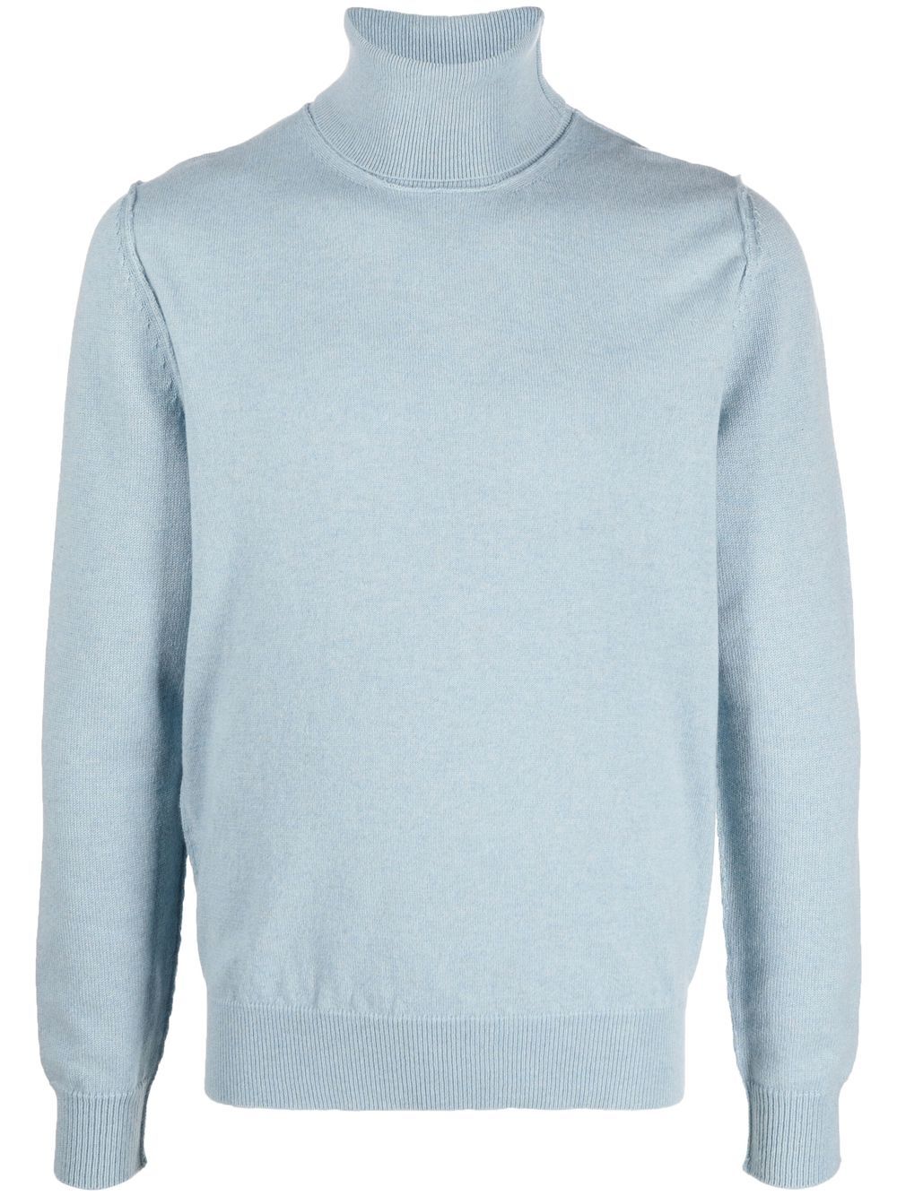 roll-neck cashmere jumper from Maison Margiela featuring light blue, cashmere, knitted construction, roll neck, long sleeves, fitted-cuff sleeves and straight hem.