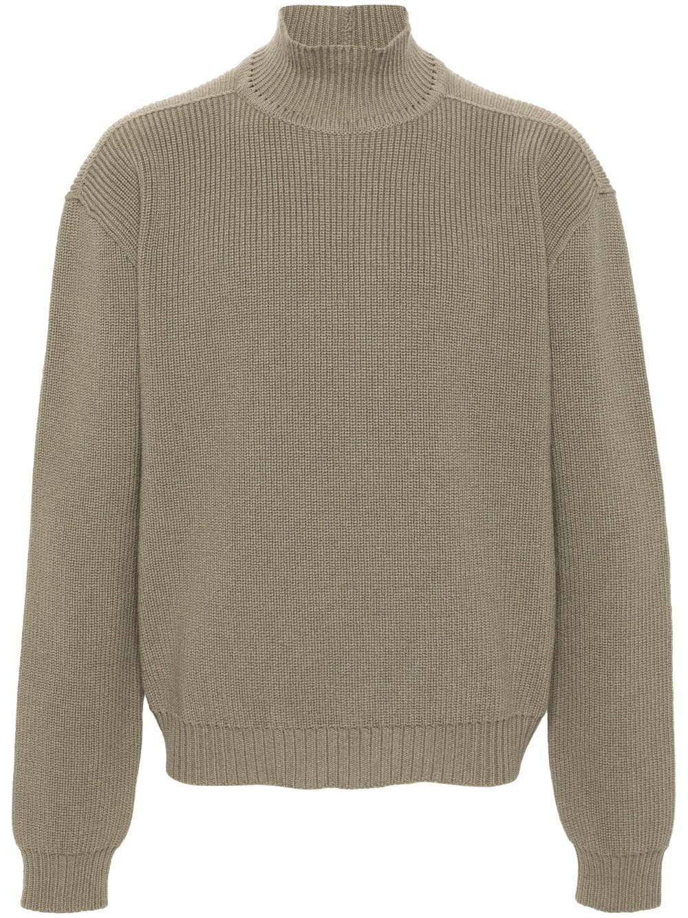moss green virgin wool chunky knit roll neck drop shoulder long sleeves ribbed cuffs and hem unlined