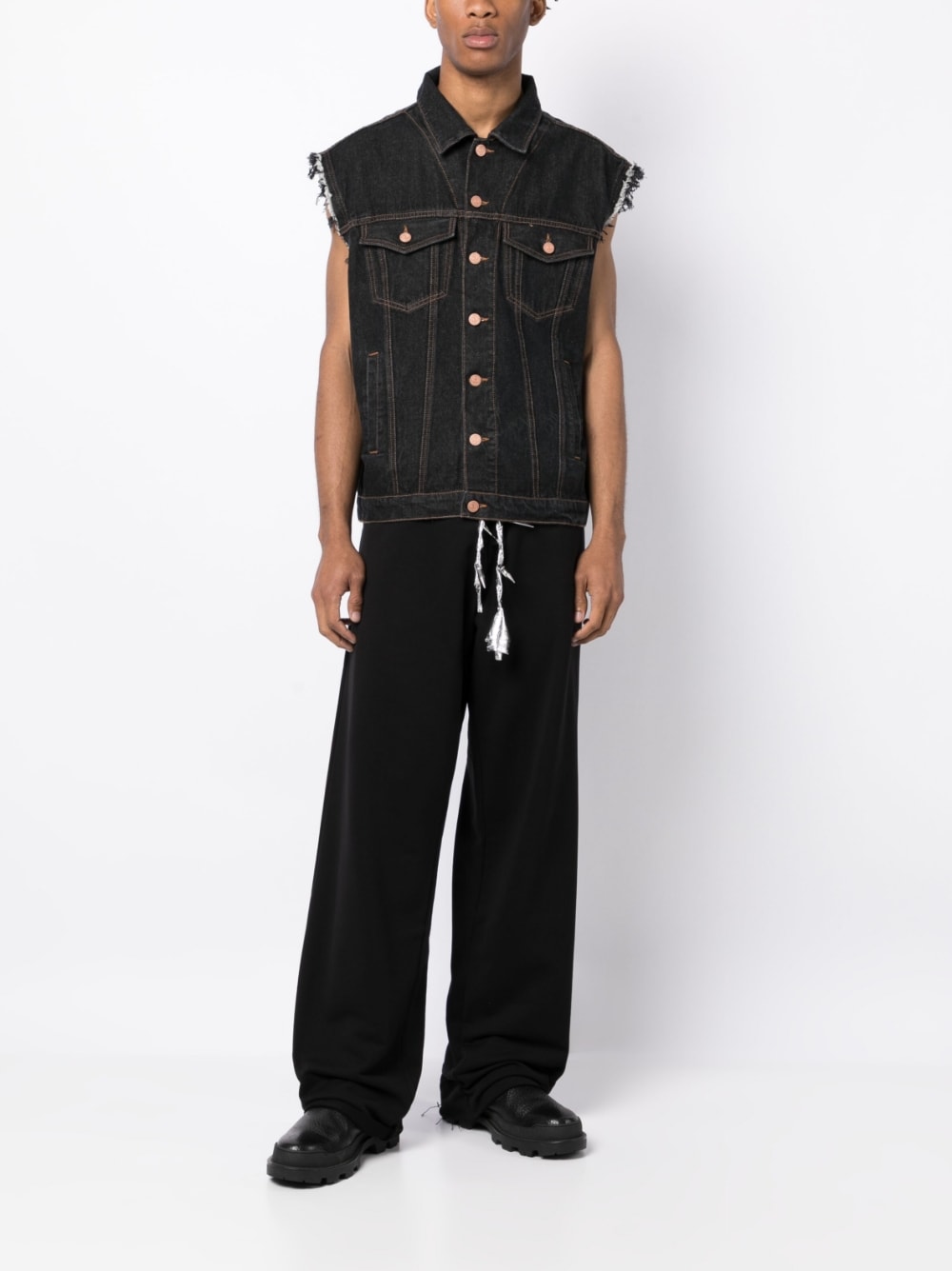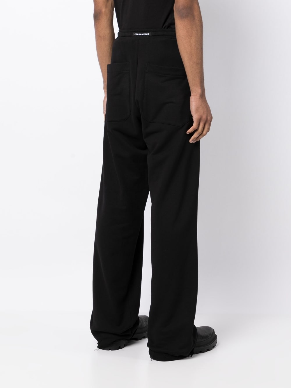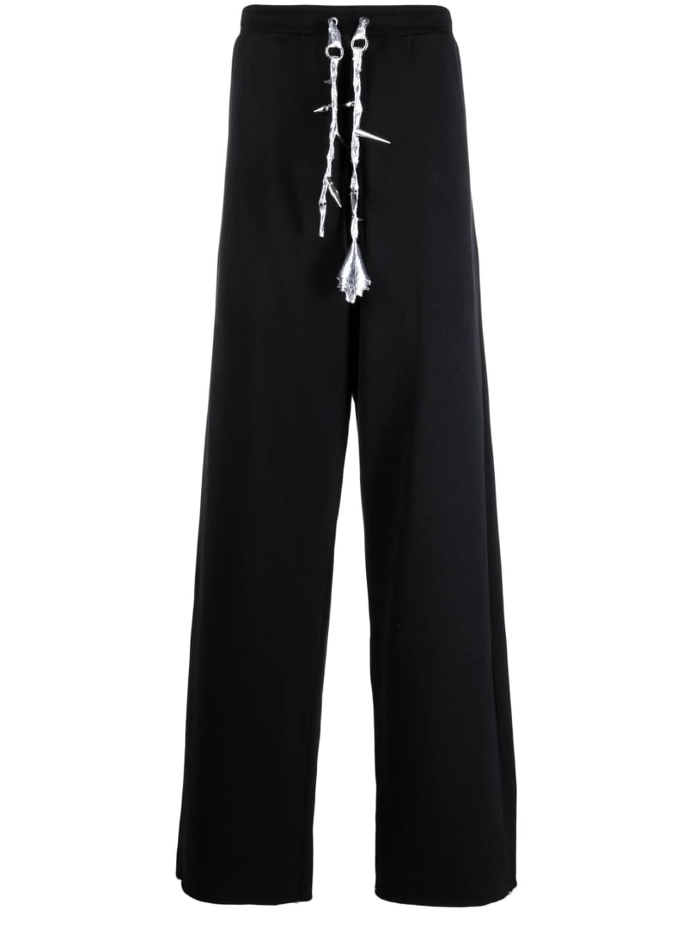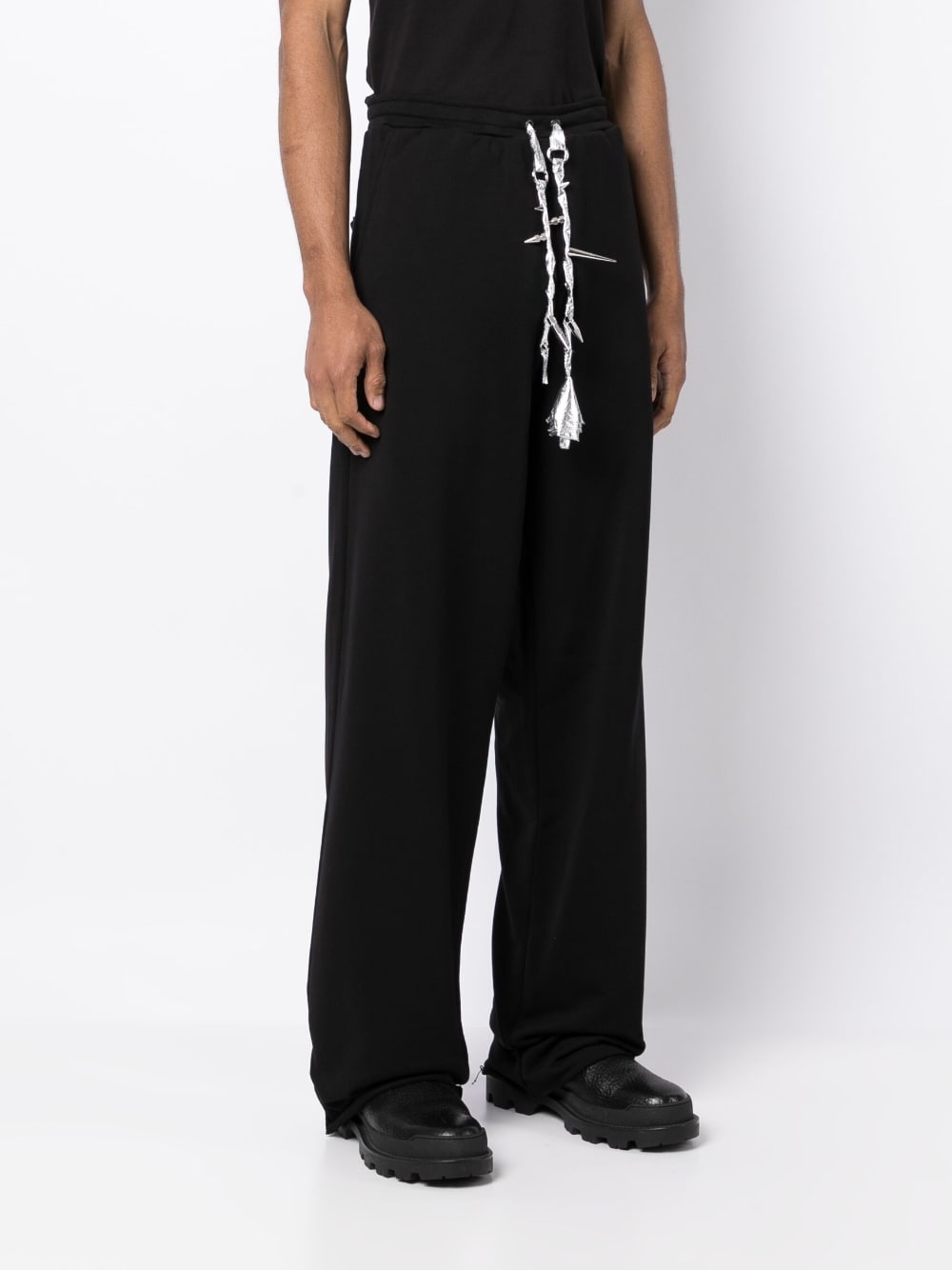 Ruby cotton track pants from JORDANLUCA featuring black, cotton, stainless steel, elasticated drawstring waistband, straight leg and Signature silver spiked rose cords.