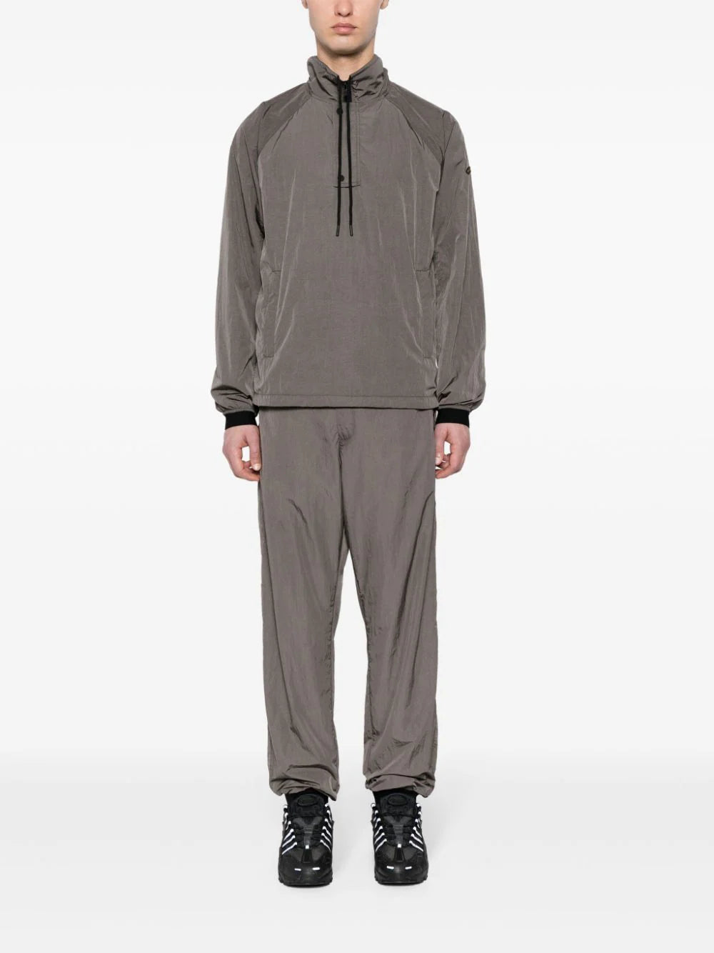 taupe grey appliqué logo drawstring neck press-stud placket pullover design long raglan sleeves ribbed cuffs two side zip-fastening welt pockets