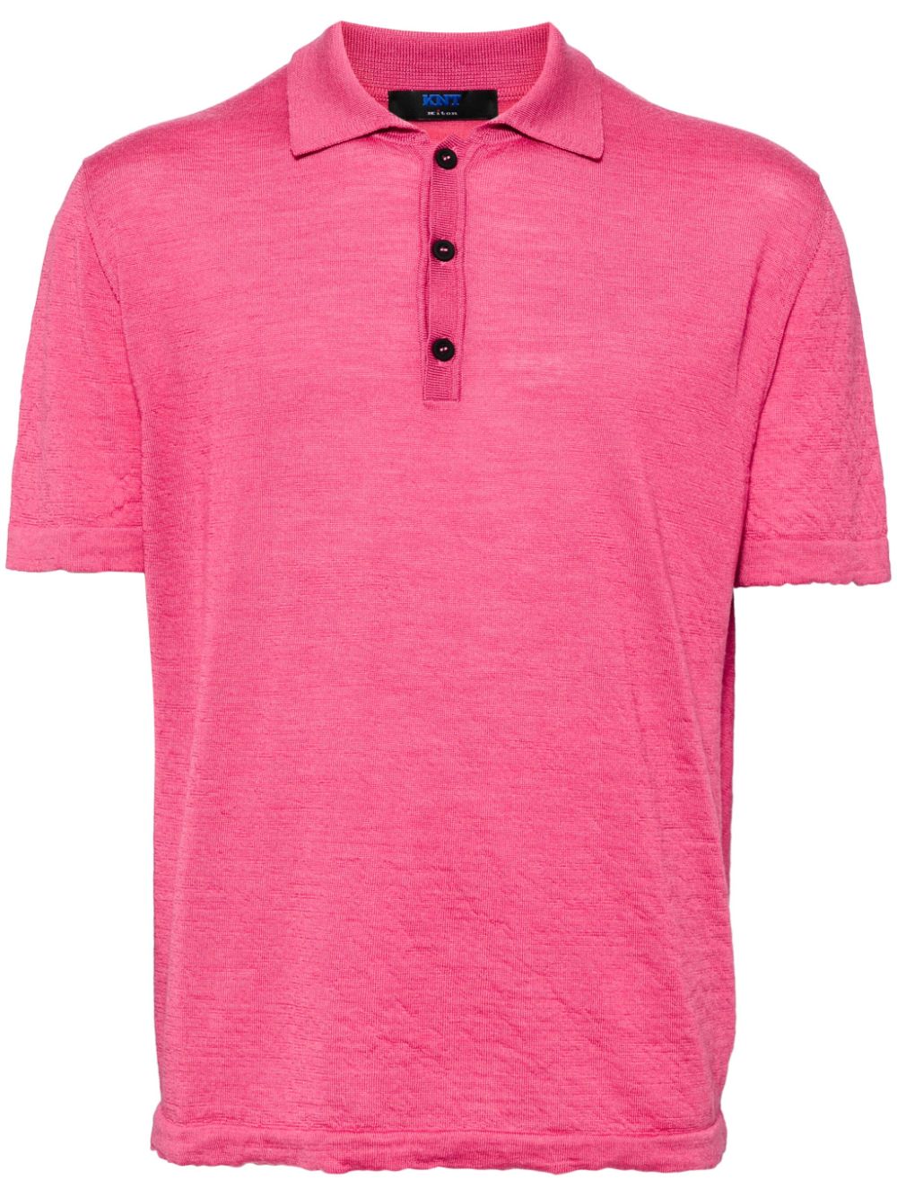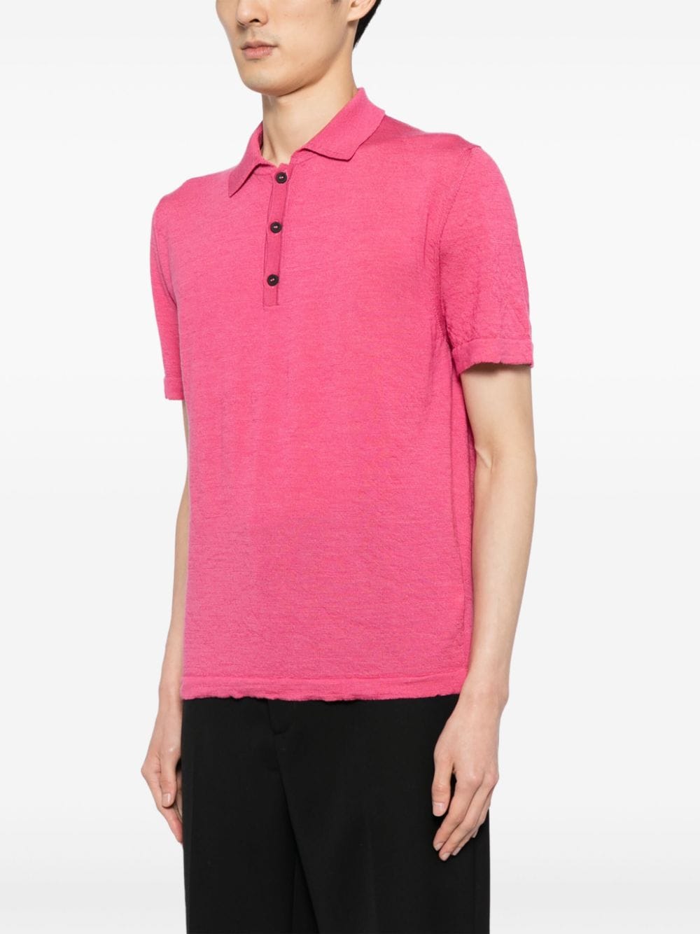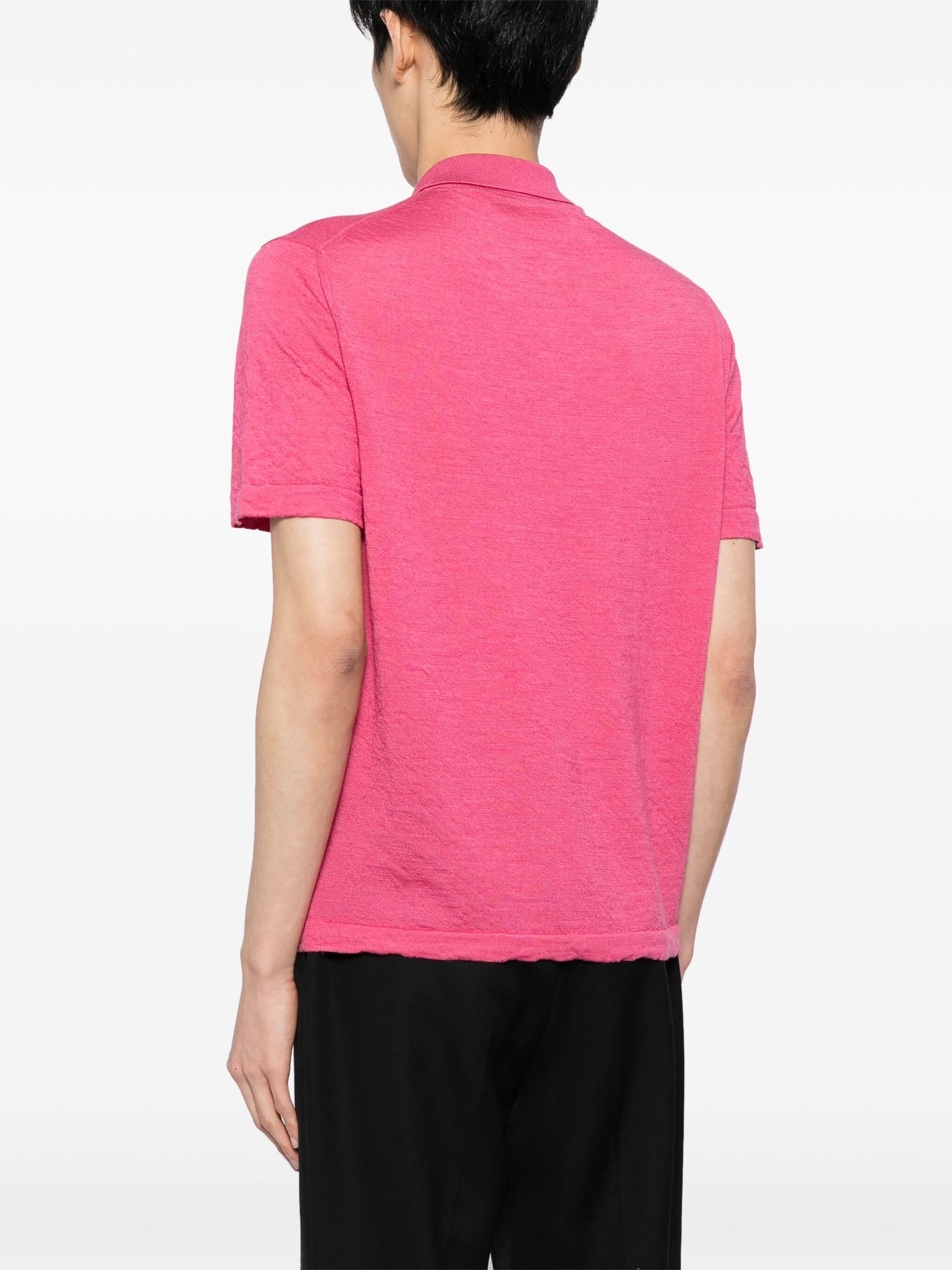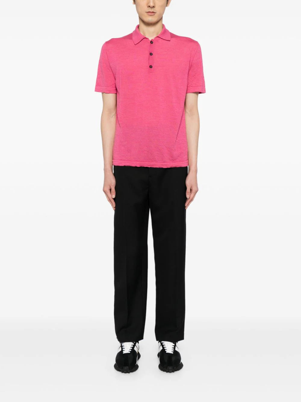flamingo pink virgin wool-silk blend polo collar front button placket short sleeves straight hem