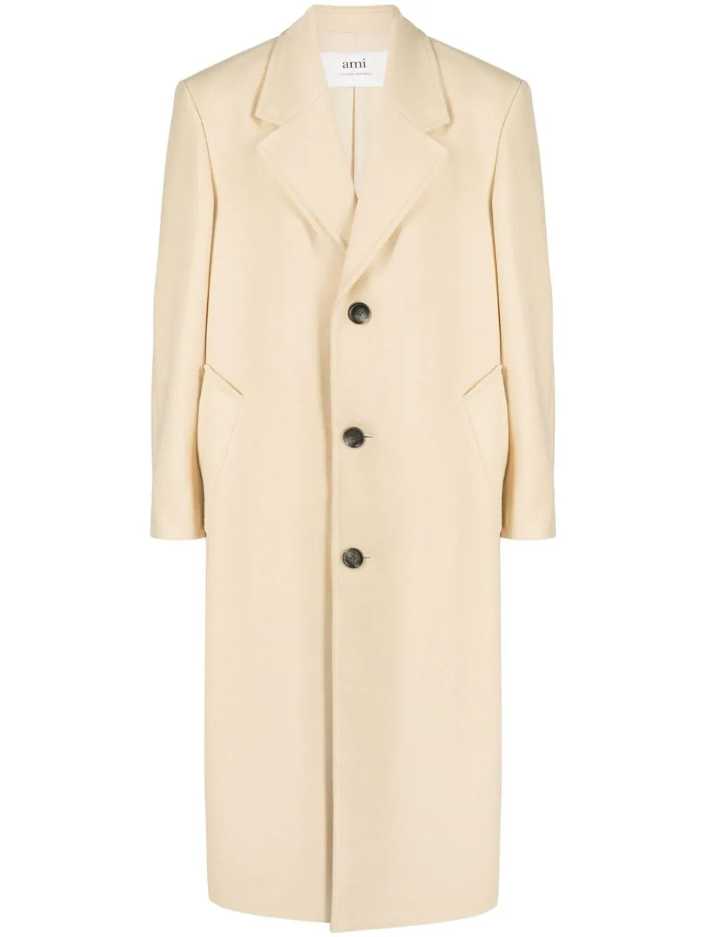 light beige virgin wool blend notched lapels long sleeves front button fastening buttoned cuffs slip pockets to the sides calf-length straight hem