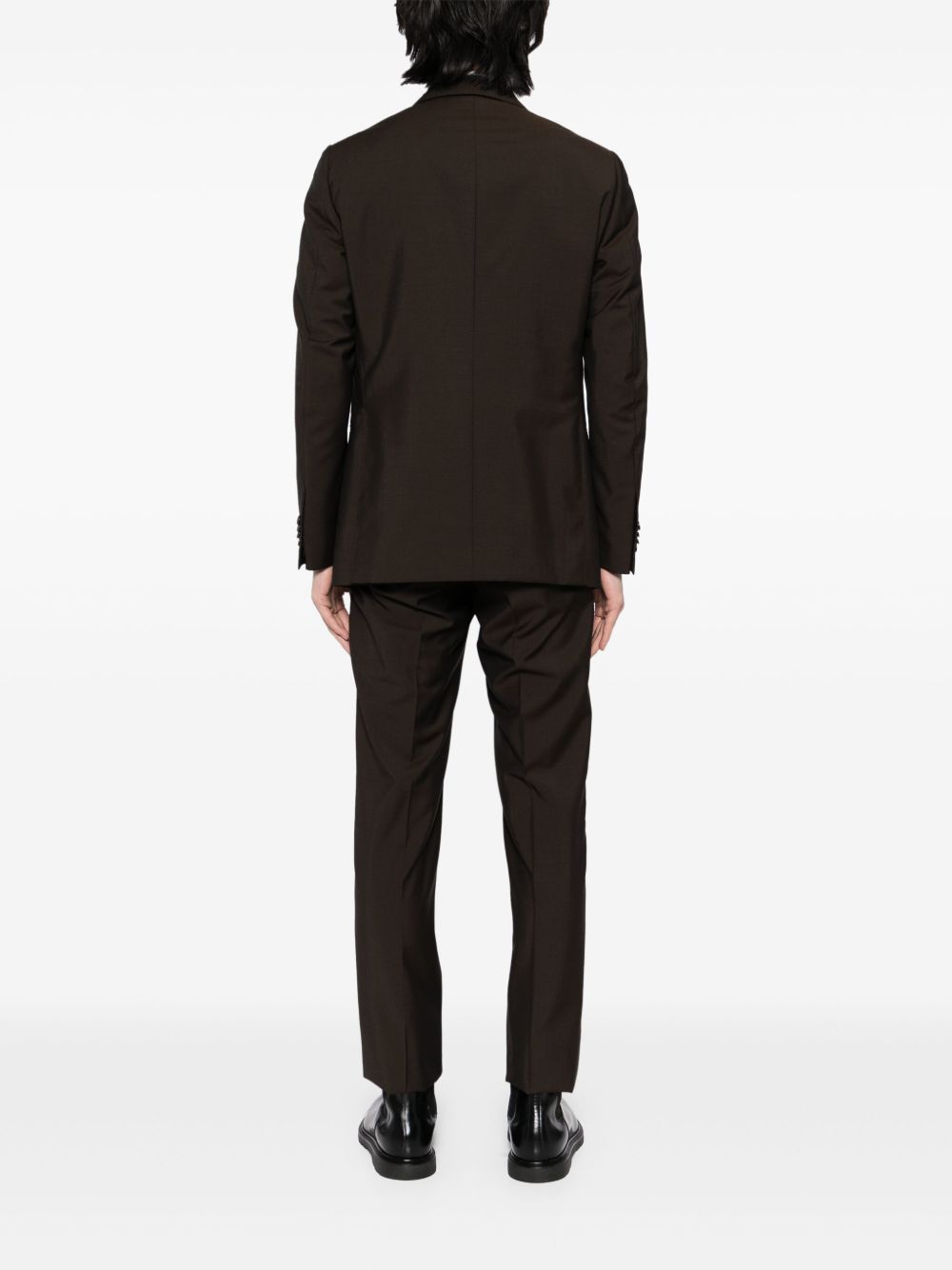This sophisticated single-breasted suit features a sleek dark brown jacket with a front button fastening, buttoned cuffs, and a matching pair of pants with a front button and zip fastening for a polished look. Complete with a rear welt pocket, this suit is the epitome of classic style and versatility.