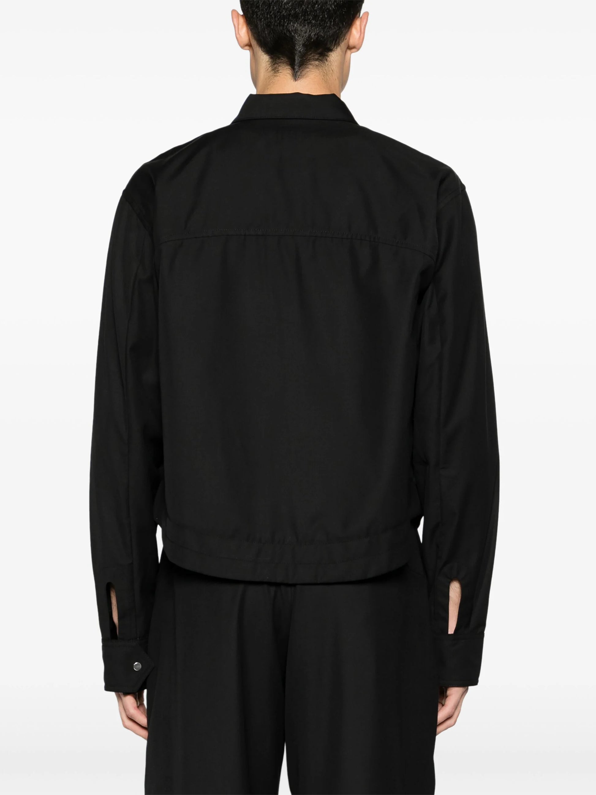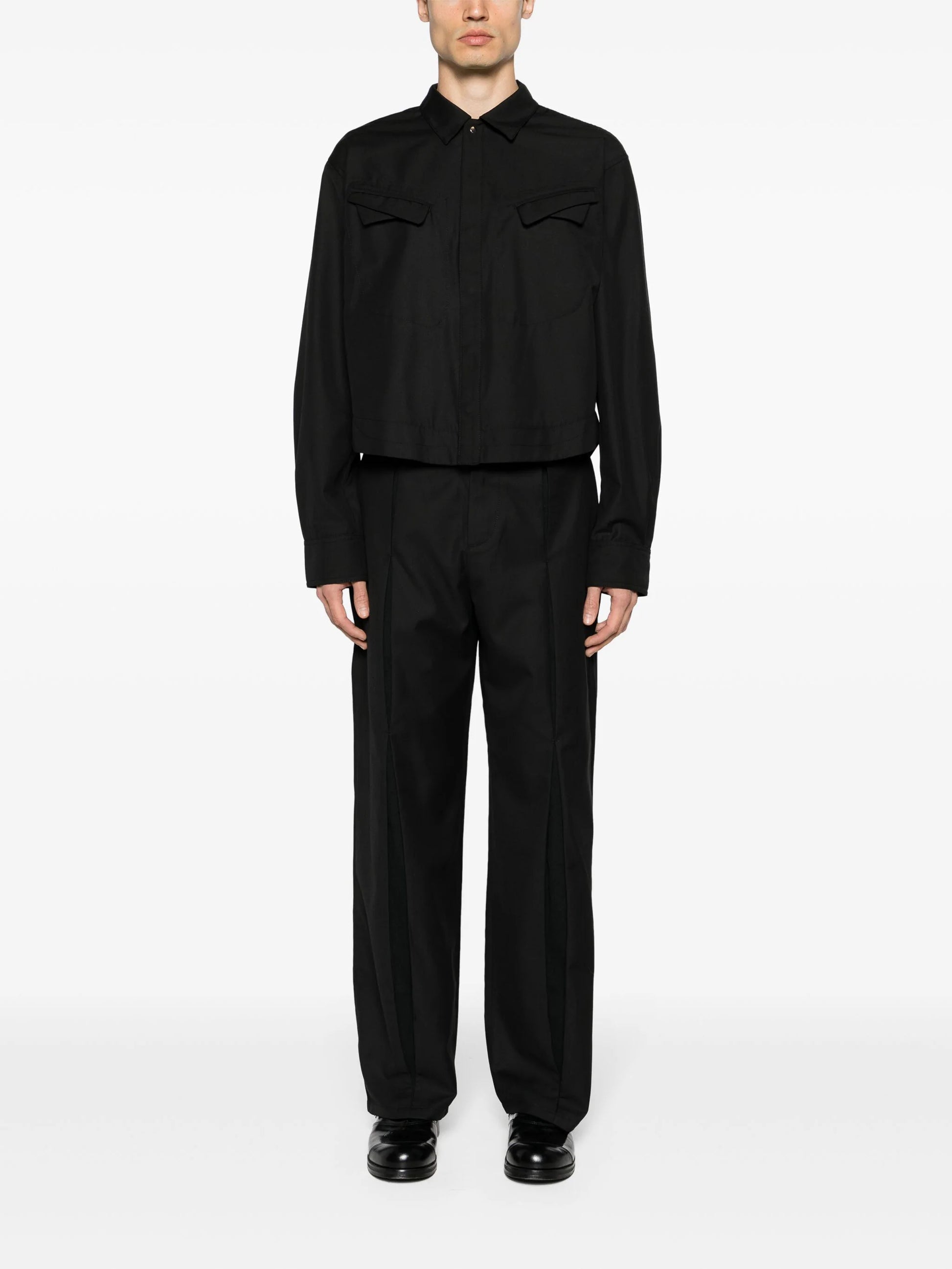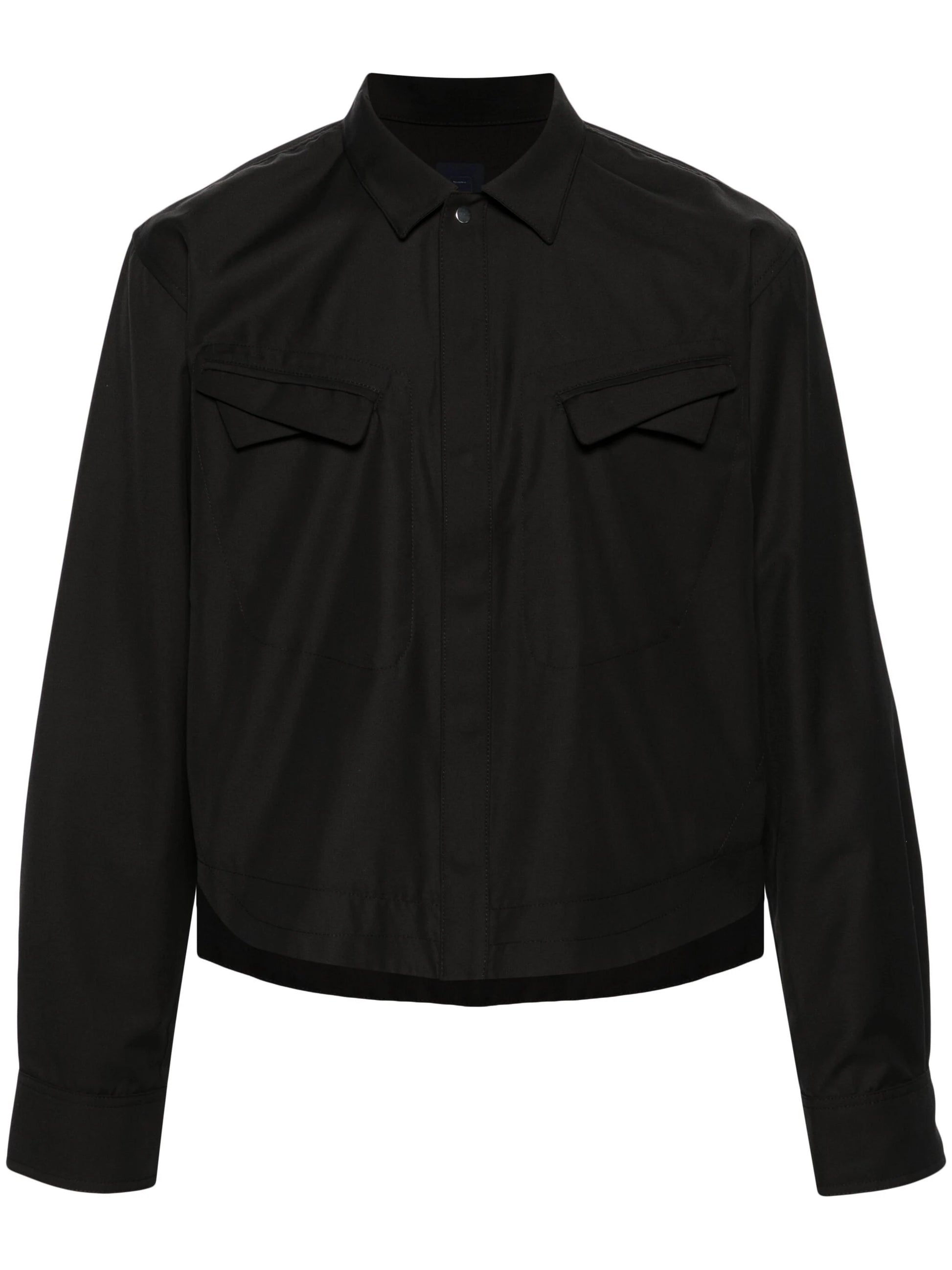 black jersey texture spread collar front press-stud fastening long sleeves with press-stud fastening cuffs two chest flap pockets cropped straight hem