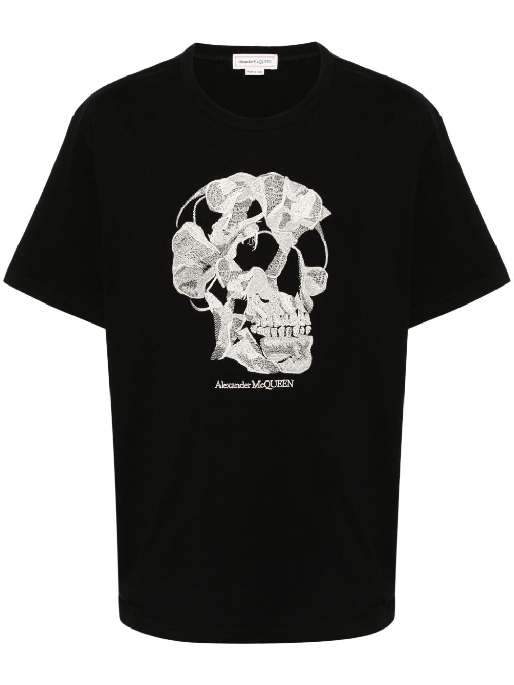 Expertly crafted from high-quality cotton jersey, this black t-shirt features a ribbed crew neck and short sleeves for ultimate comfort. The front is adorned with a striking skull embroidery and our logo, adding a touch of edginess to any outfit. Pair with your favorite jeans for a cool and stylish look.