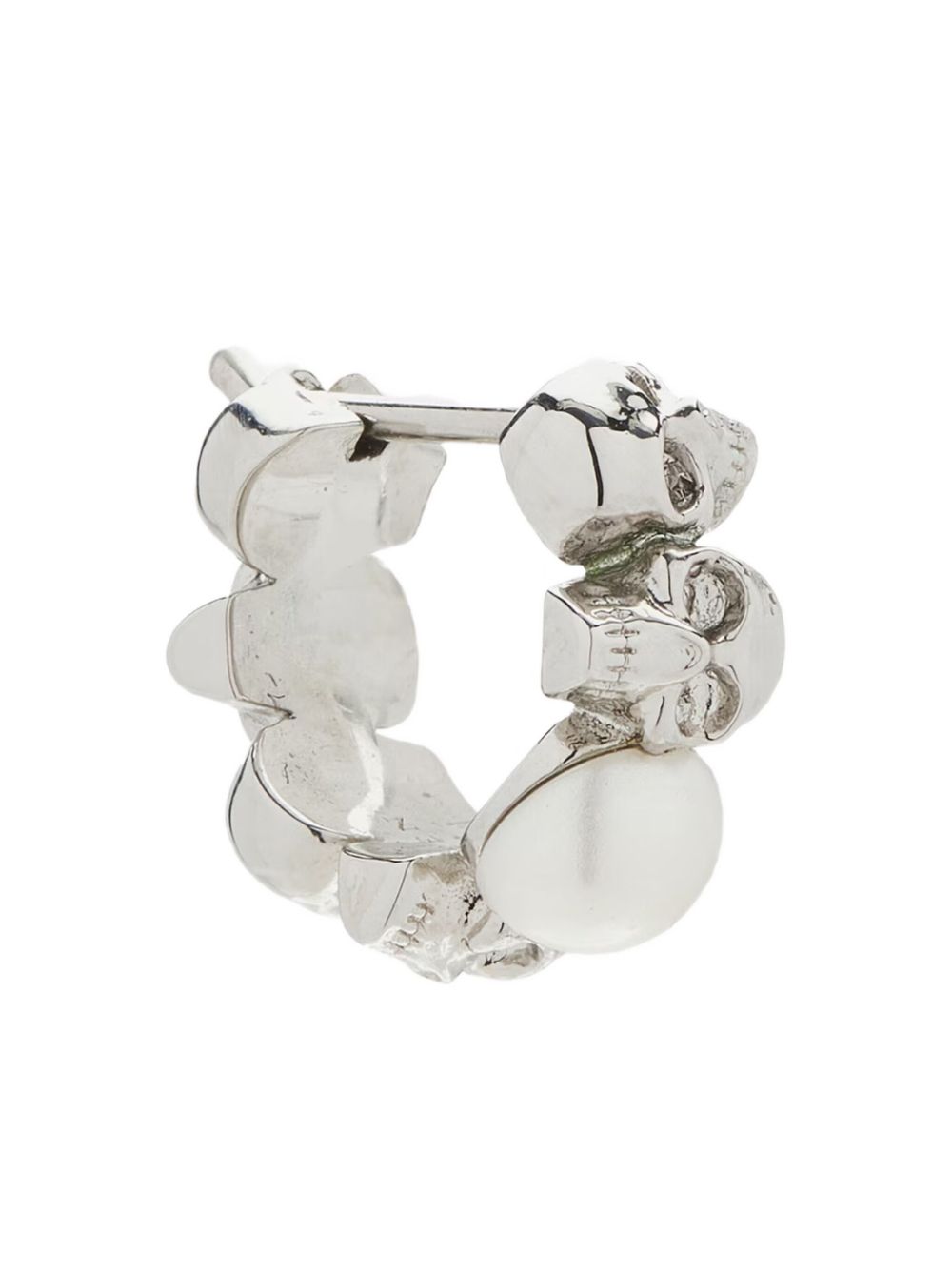 This silver-tone hoop earring features a striking skull motif accented with delicate pearl embellishments, blending edgy and elegant styles. Designed as a single piece for the right ear, it offers a distinctive statement for those seeking unique, expert-crafted jewelry.