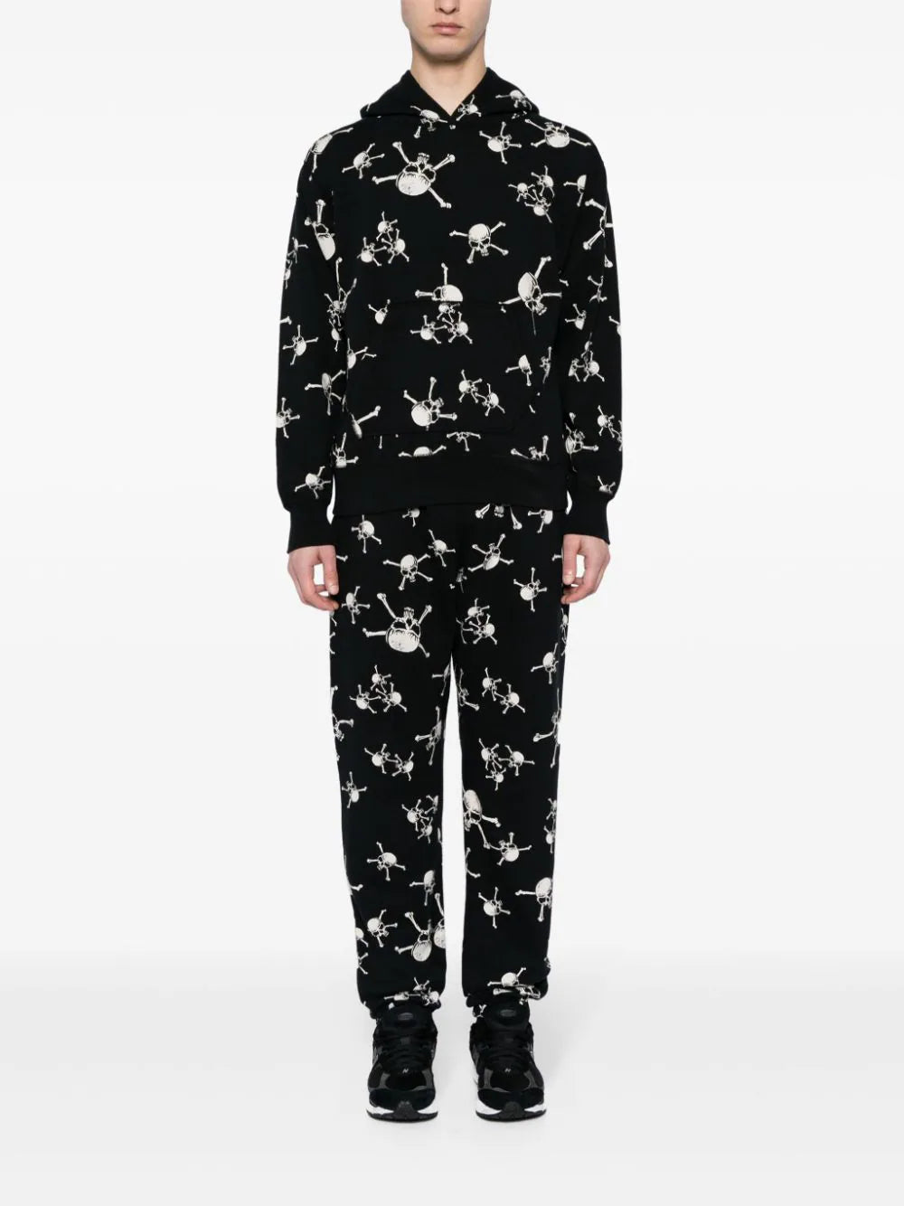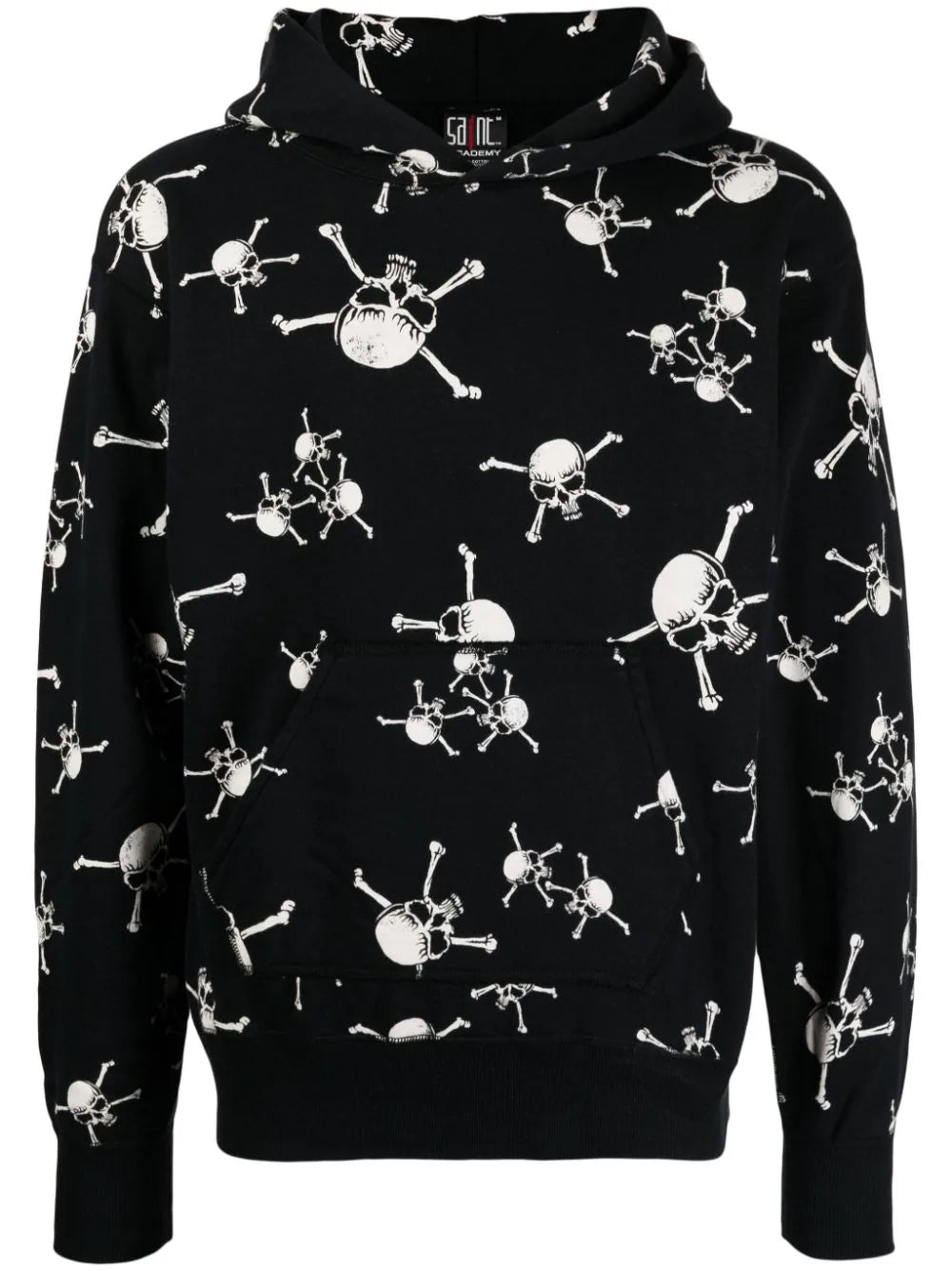 black cotton jersey texture skull print all-over graphic print classic hood front pouch pocket long sleeves straight hem