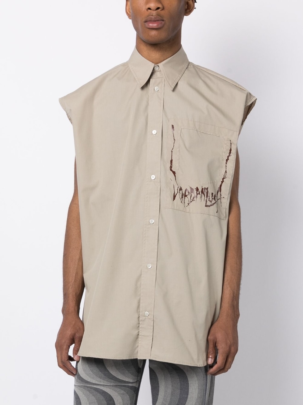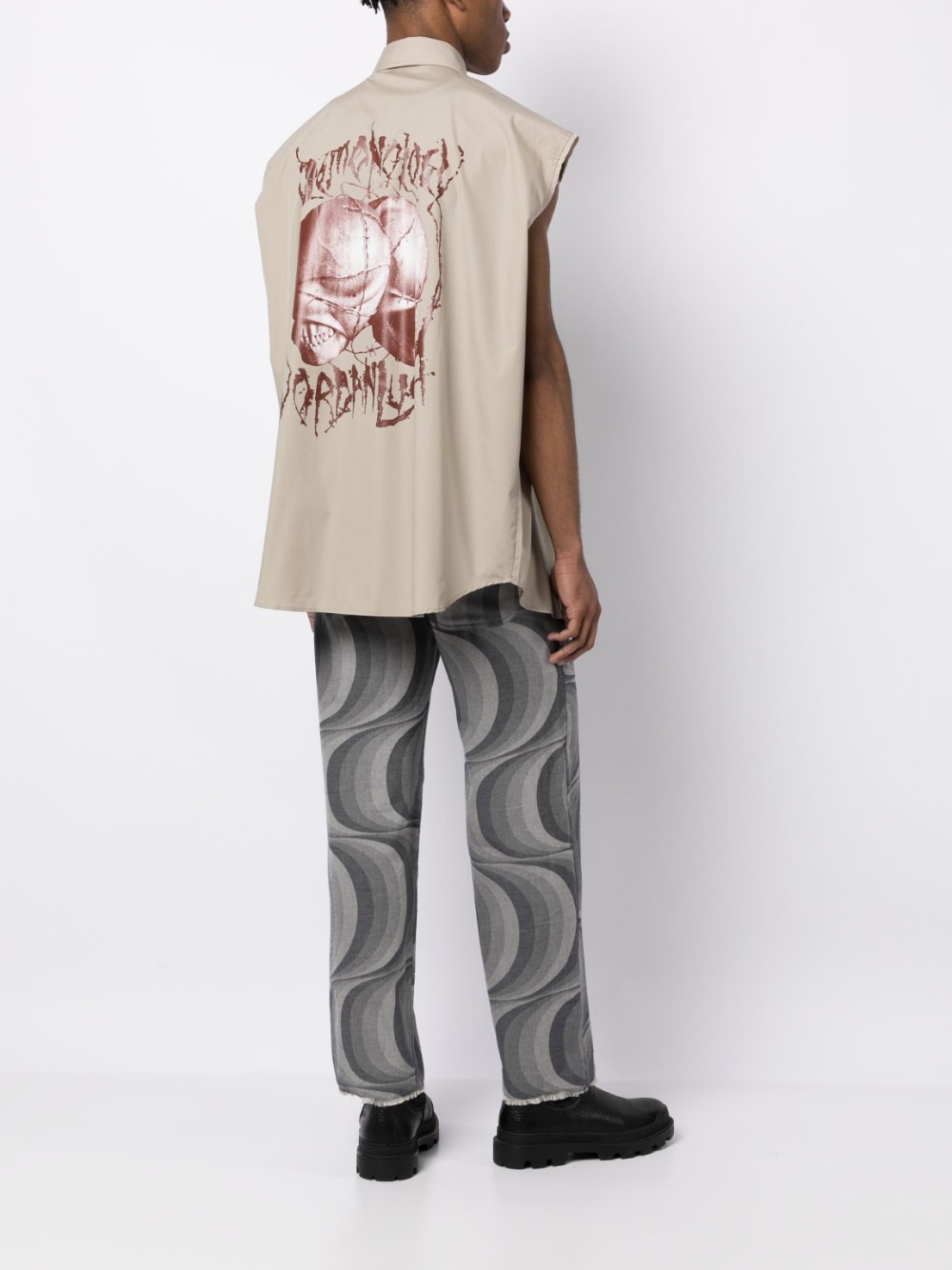 Skulls cotton shirt from JORDANLUCA featuring sand beige, cotton, logo print at the chest, skull print, graphic print to the rear, classic collar, front button fastening, sleeveless and chest patch pocket.
