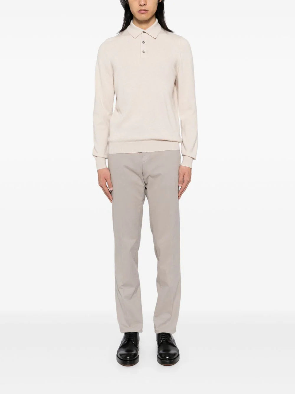 beige cashmere knitted construction front button placket polo collar long sleeves ribbed cuffs and hem
